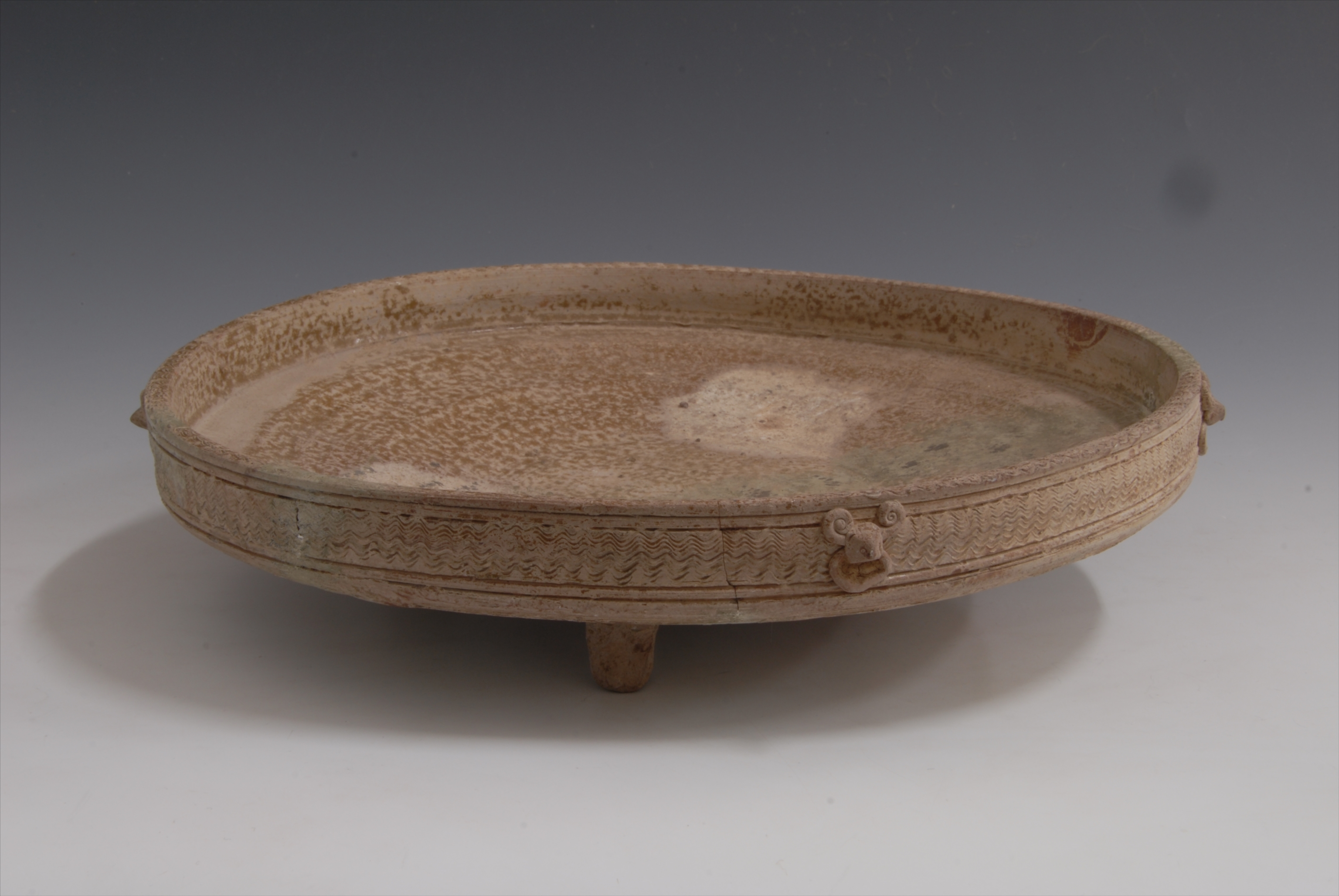 战国四系水波纹三足原始青瓷盘