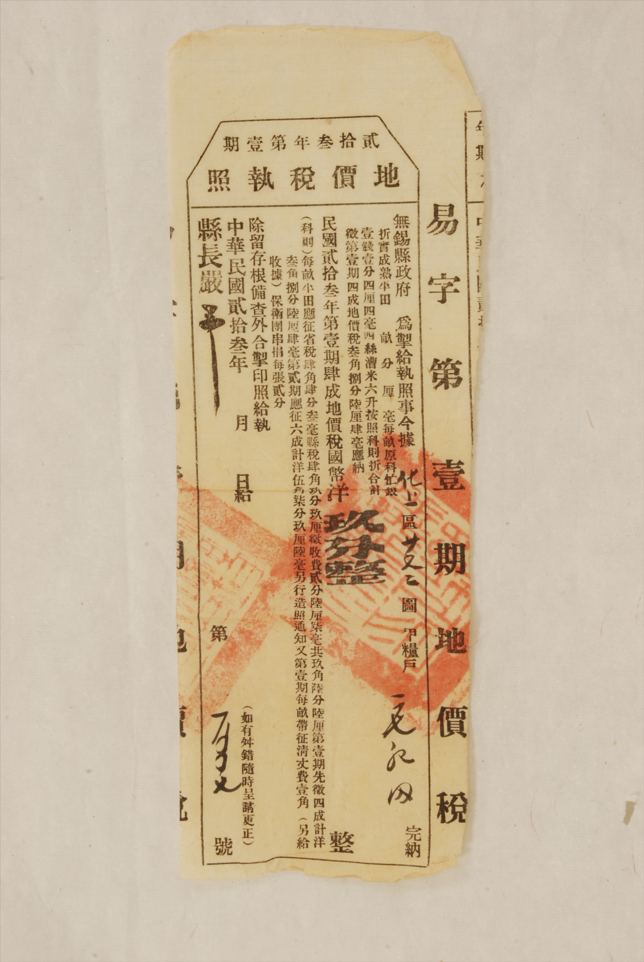 1934年无锡县政府颁发给毛纪田的第一期地价税执照