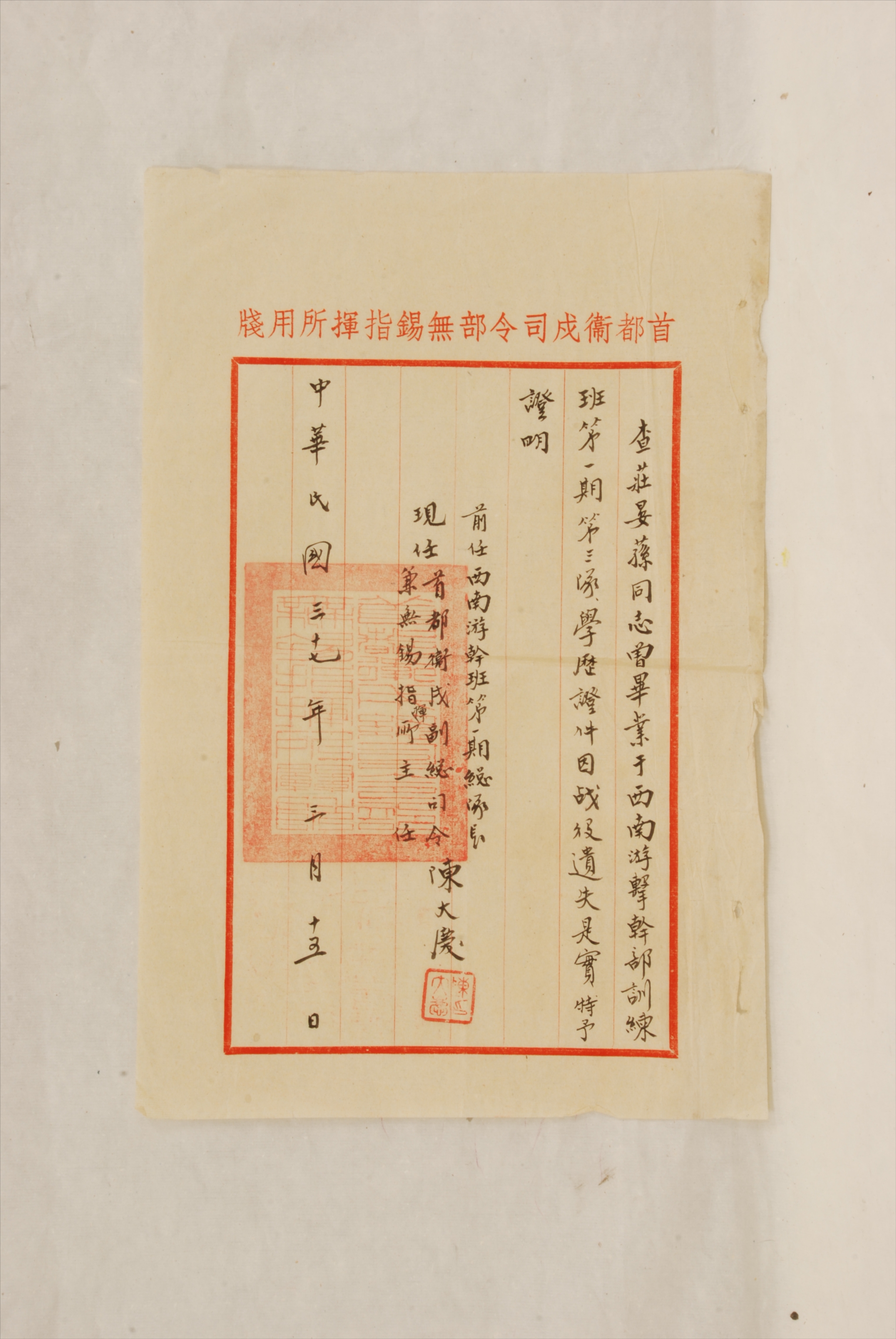 1948年3月15日首都卫戍副总司令兼无锡指挥所主任陈大庆给庄晏荪出具的证明书