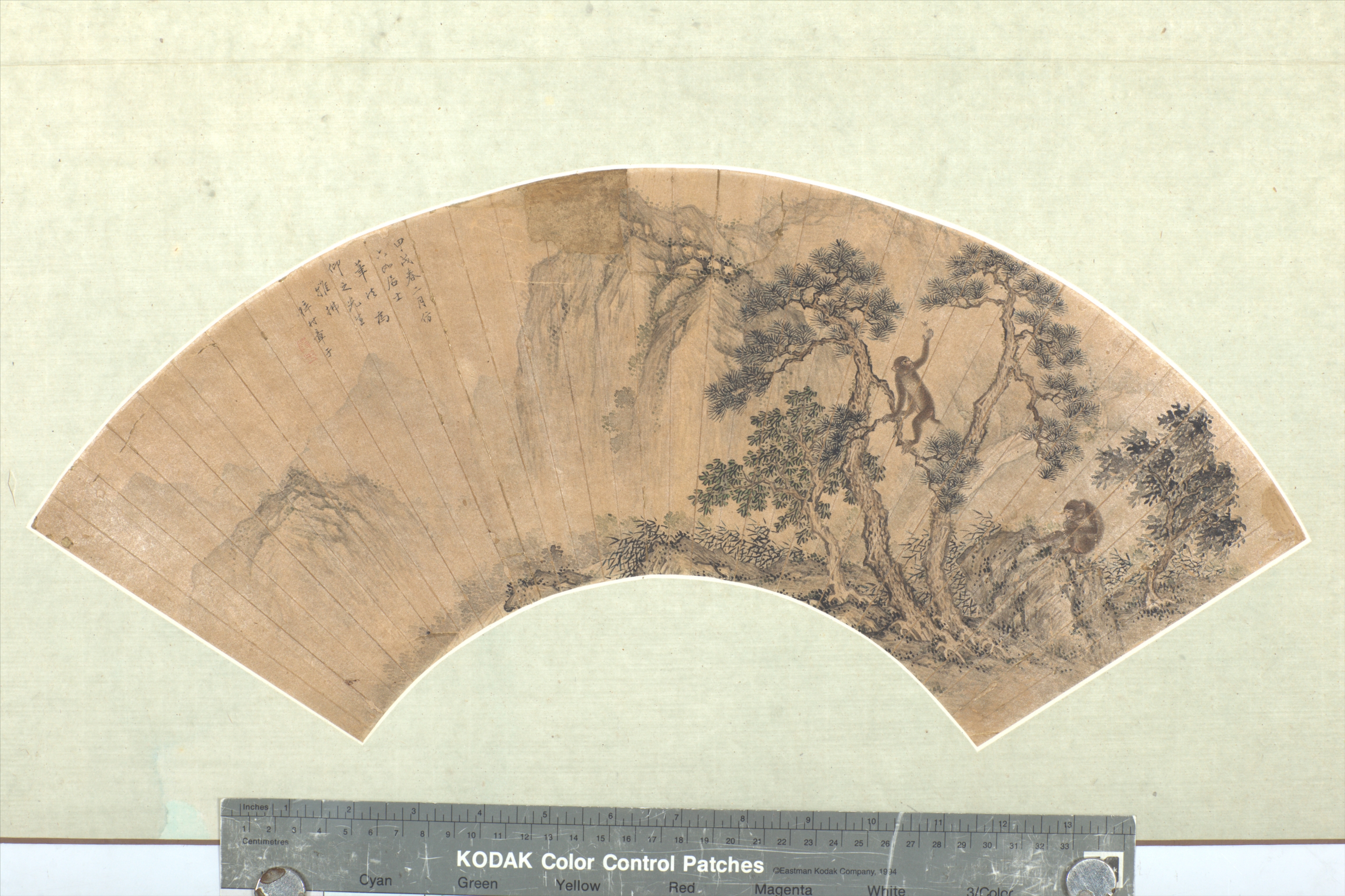 清章于山石树猴图扇面