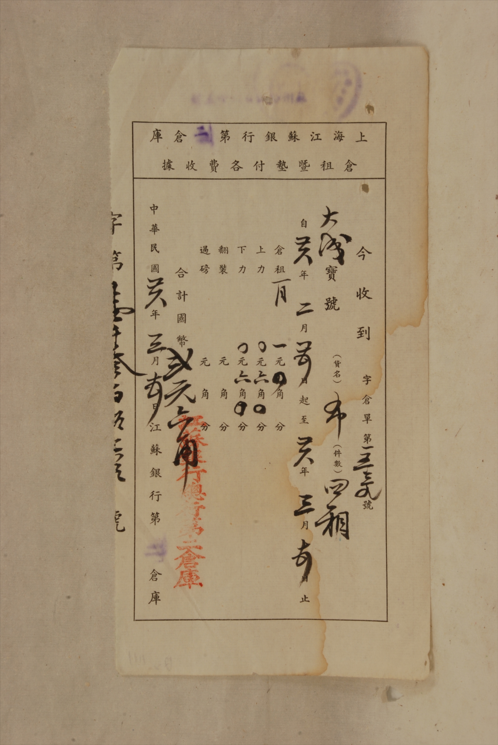 1937年上海江苏银行第二仓库出具给大成宝号的仓租暨垫付各费收据