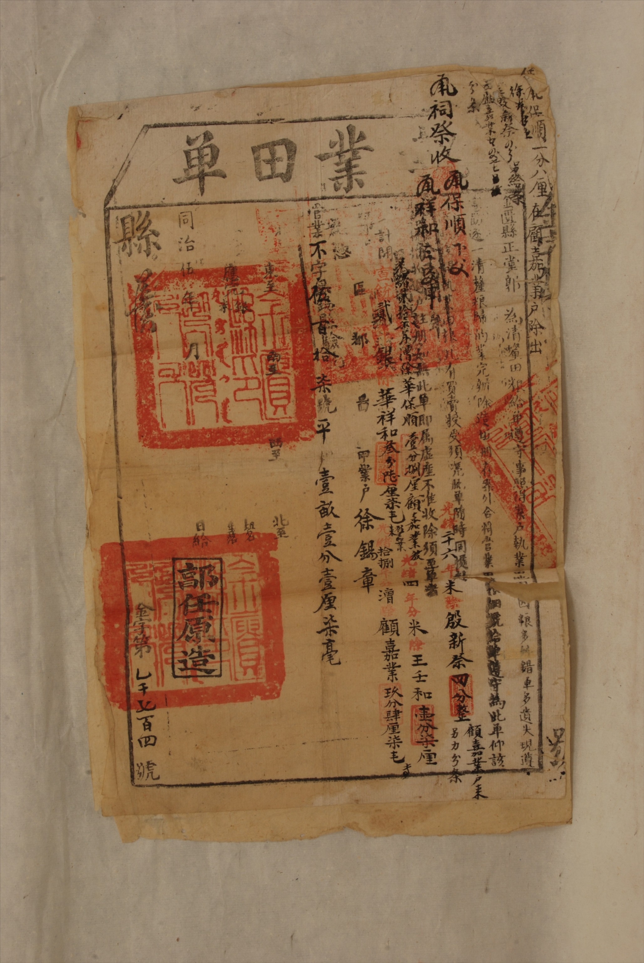 清同治五年金匮县颁发给徐锡章的执业田单