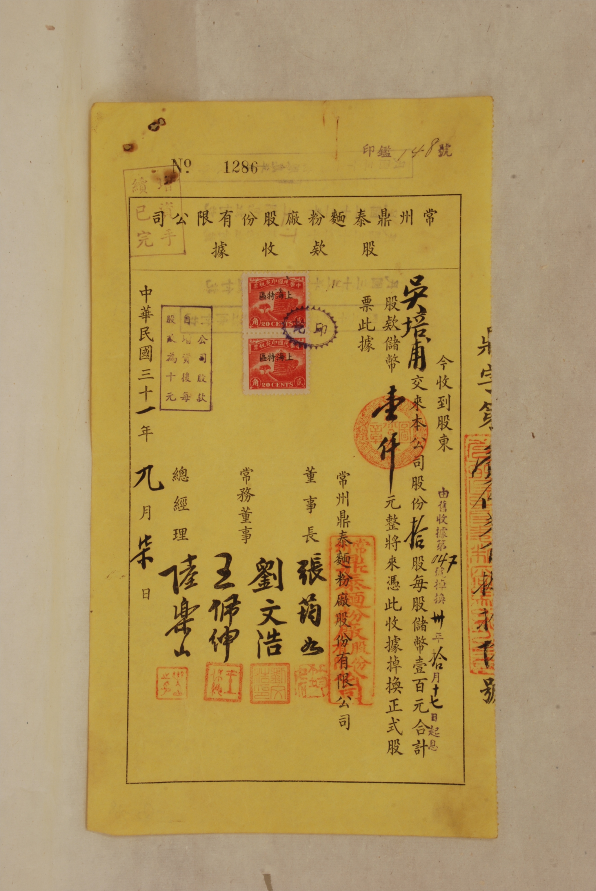 1942年9月7日常州鼎泰面粉厂股份有限公司出具给吴培甫的股款收据