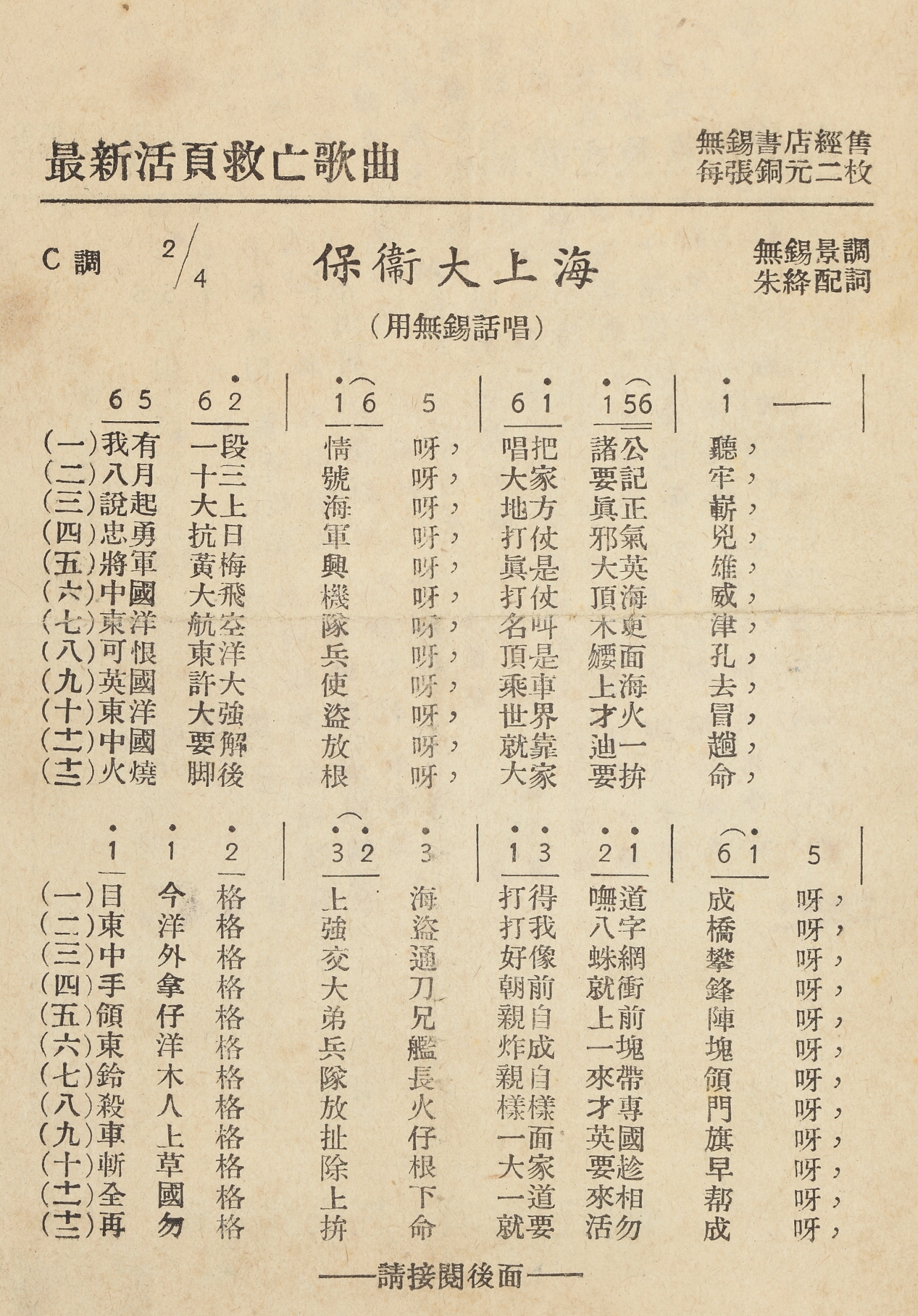 抗日战争时期无锡书店经售的最新活页救亡歌曲《保卫大上海》