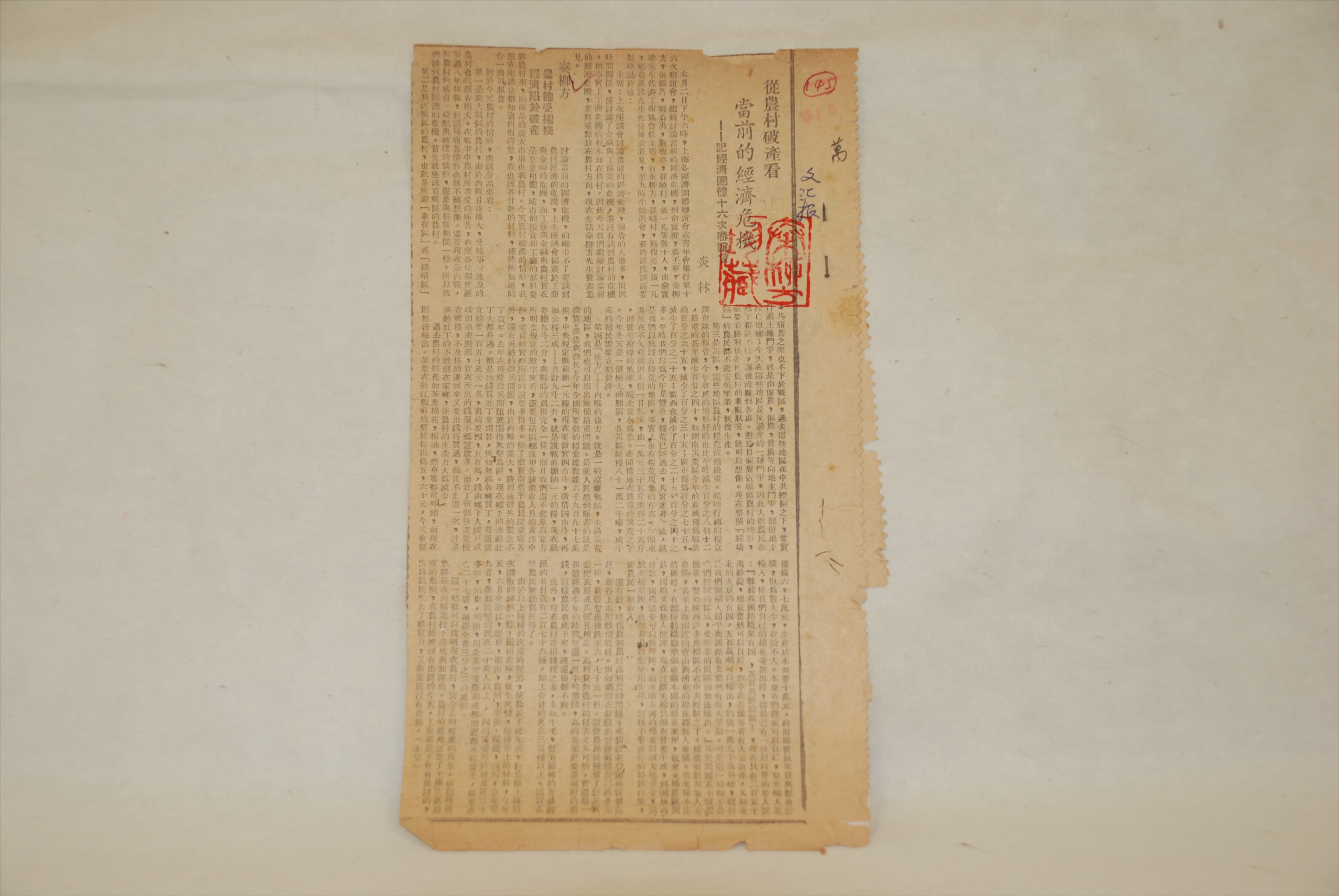 1946年12月4日秦柳方发表的《农村饱受摧残 经济陷于破产》剪报