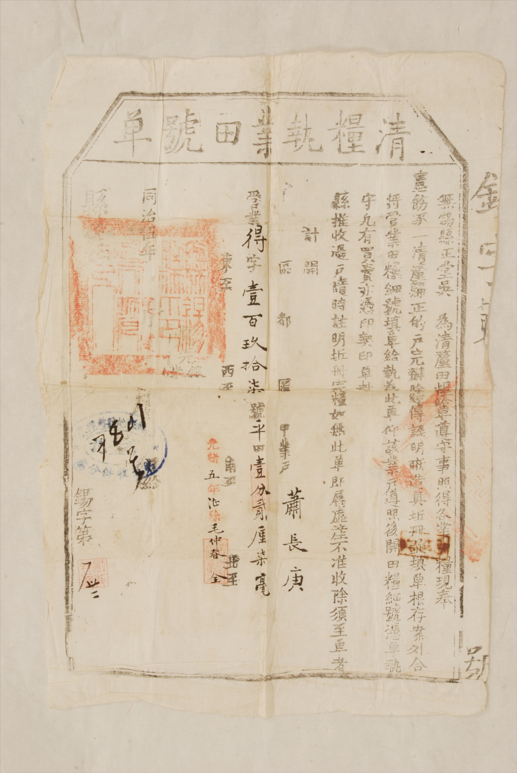 清同治五年无锡县颁发给萧长庚的清粮执业田单号