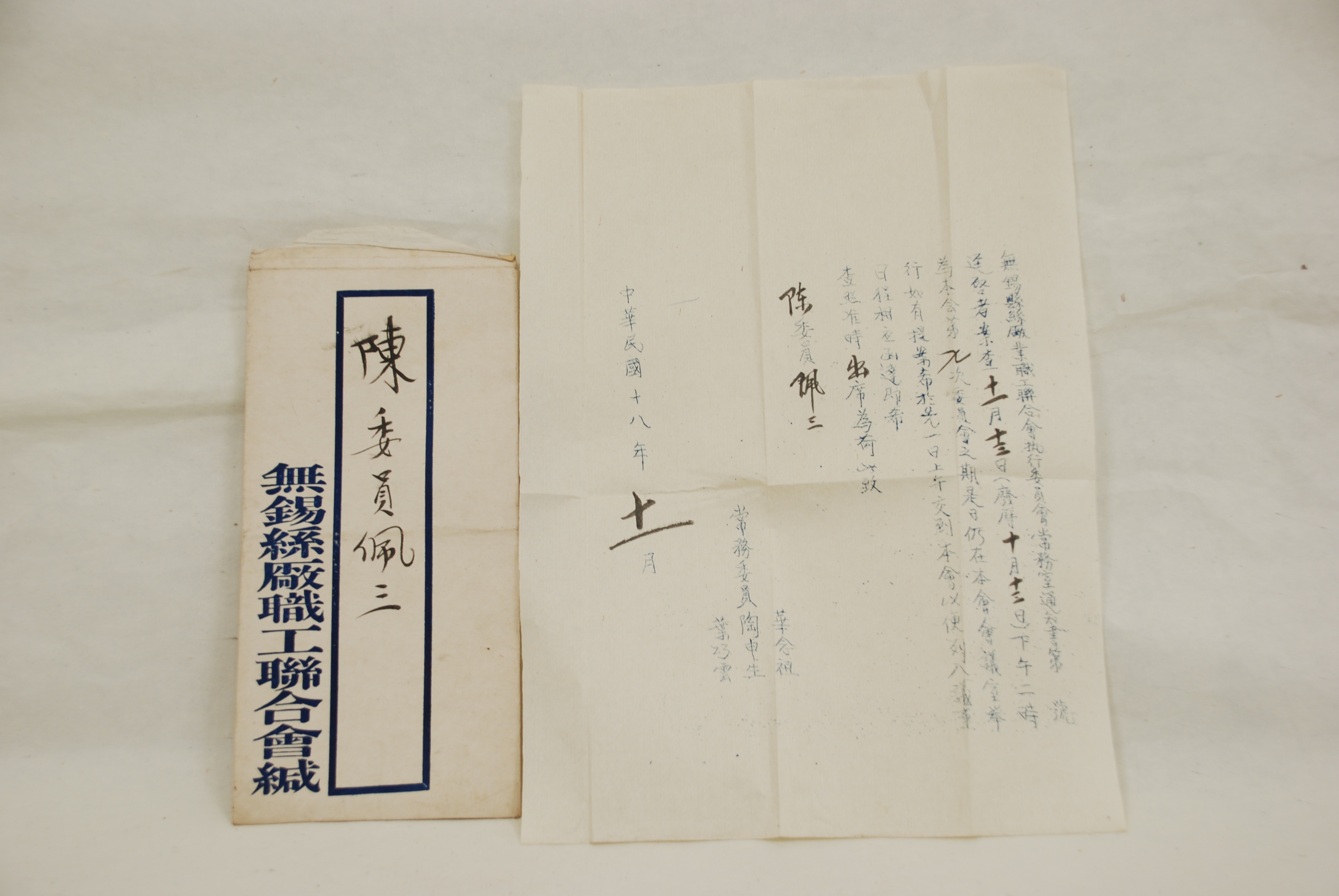 1929年11月无锡县丝厂业职工联合会给陈佩三的通知书