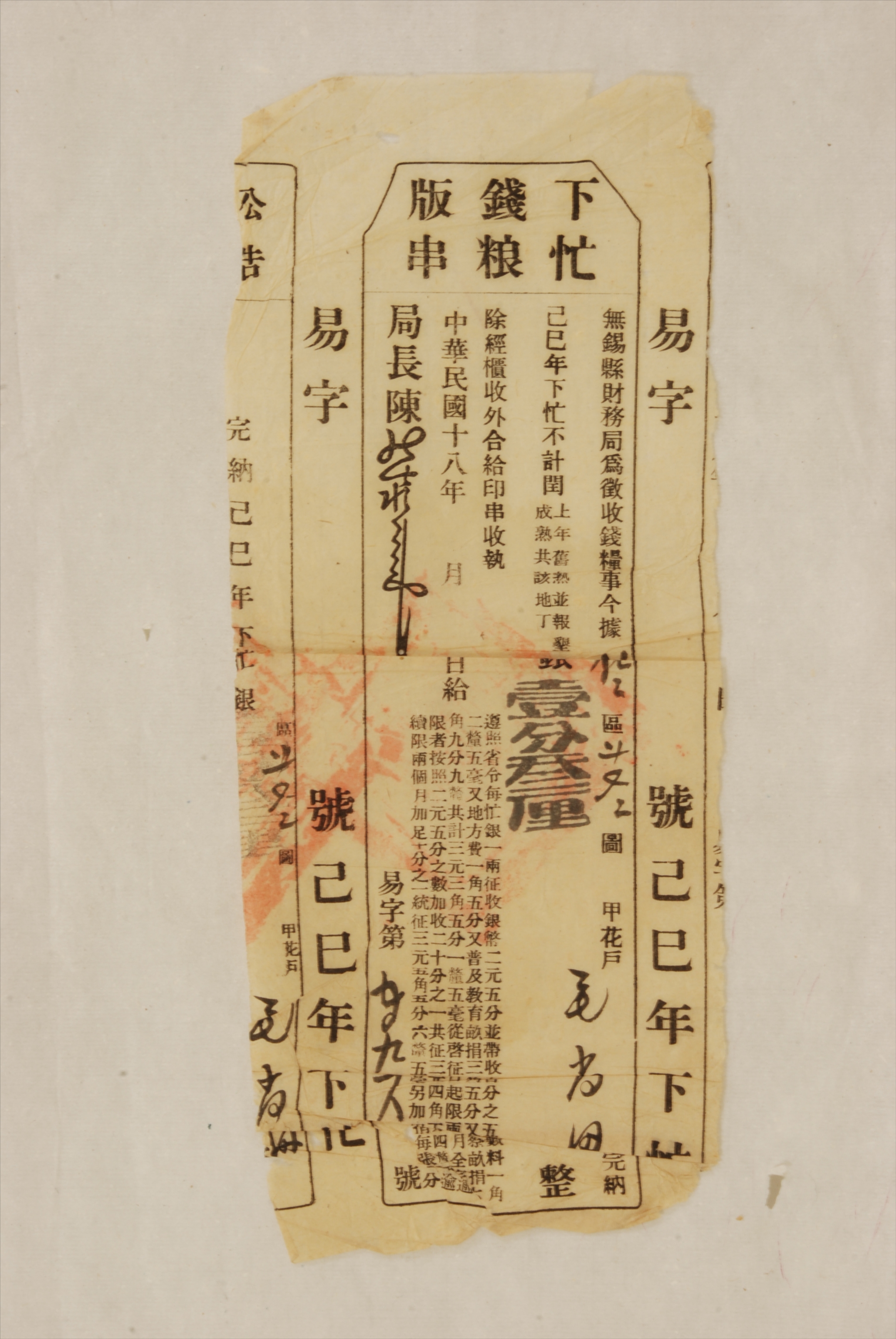 1929年无锡县财务局颁发给毛尚田的下忙钱粮版串