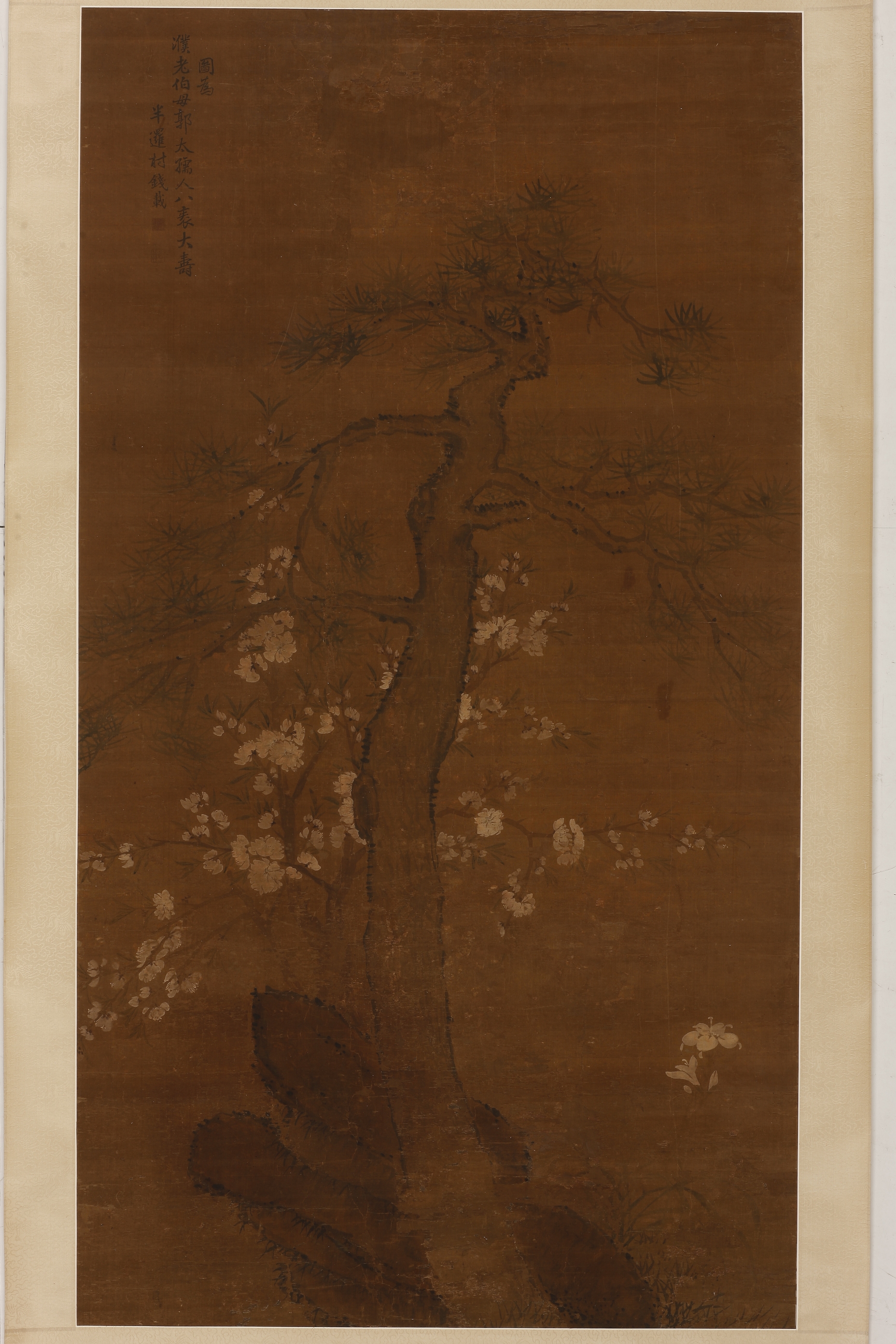 清钱载碧桃青松图轴