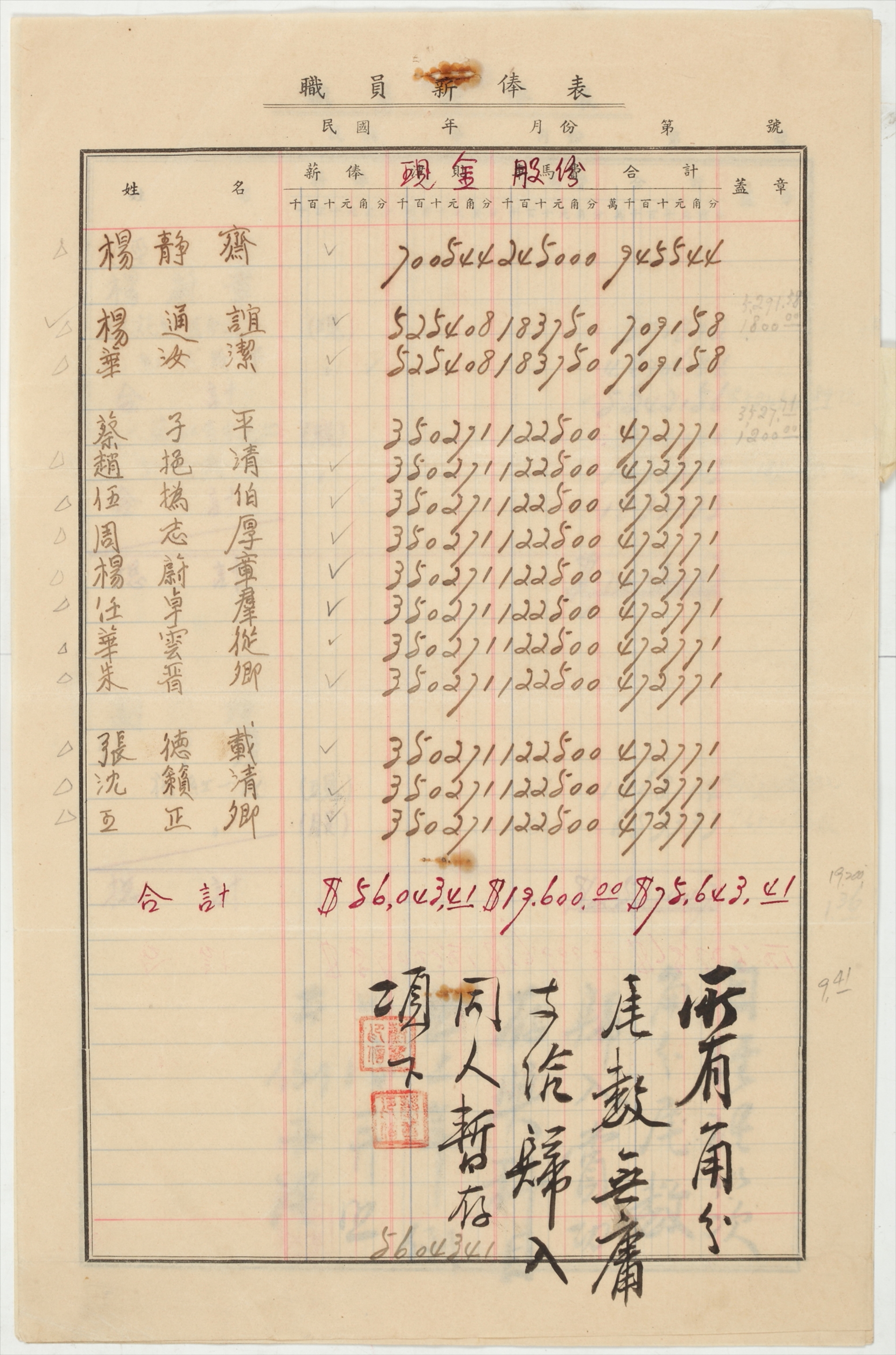 民国广丰面粉公司职员薪俸表