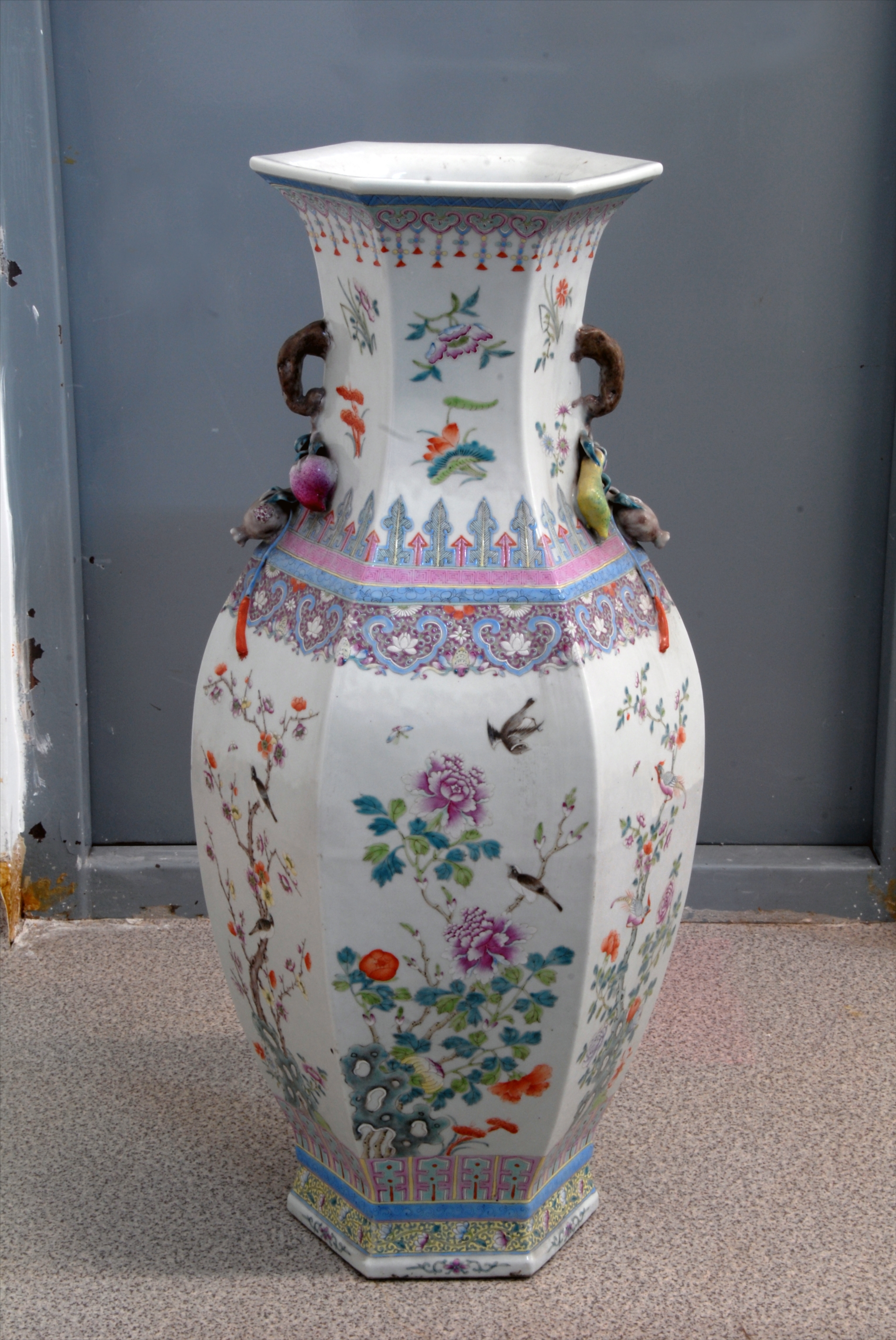 民国“大清乾隆年制”款粉彩花鸟纹双耳六角形瓷瓶