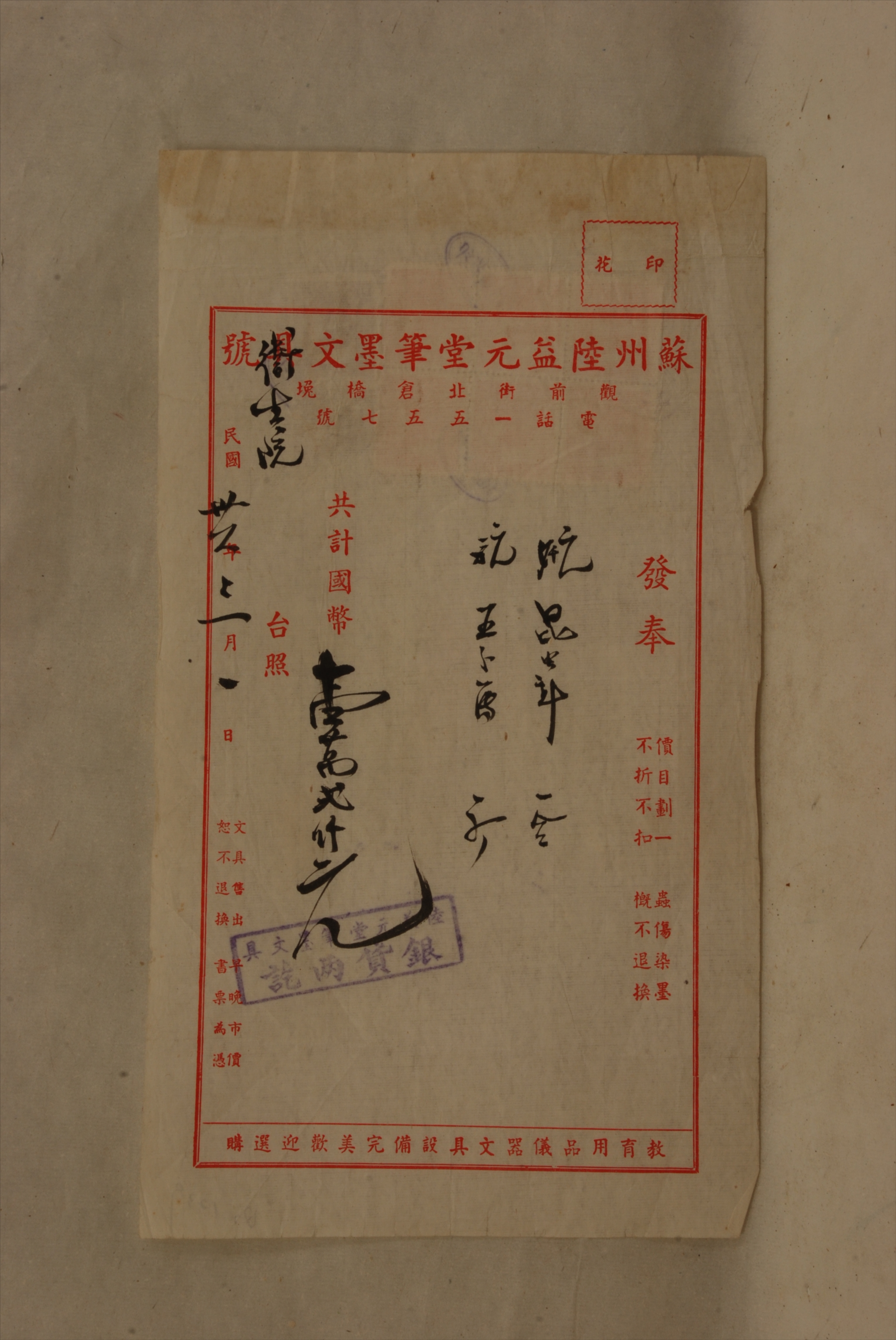 1947年3月1日苏州陆益元堂笔墨文具号出具给吴县卫生院的发票