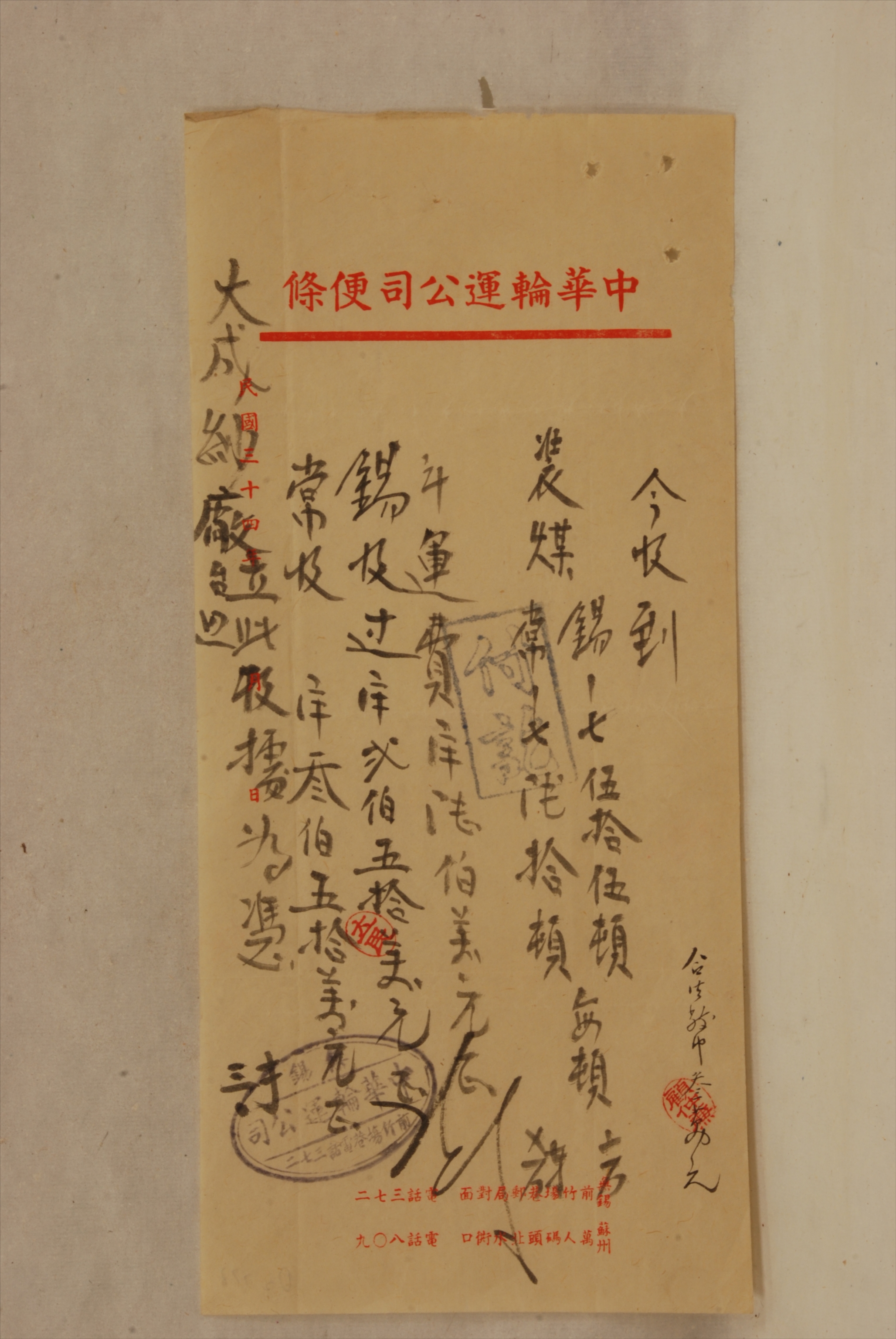 1945年中华轮运公司出具给大成纱厂的收据