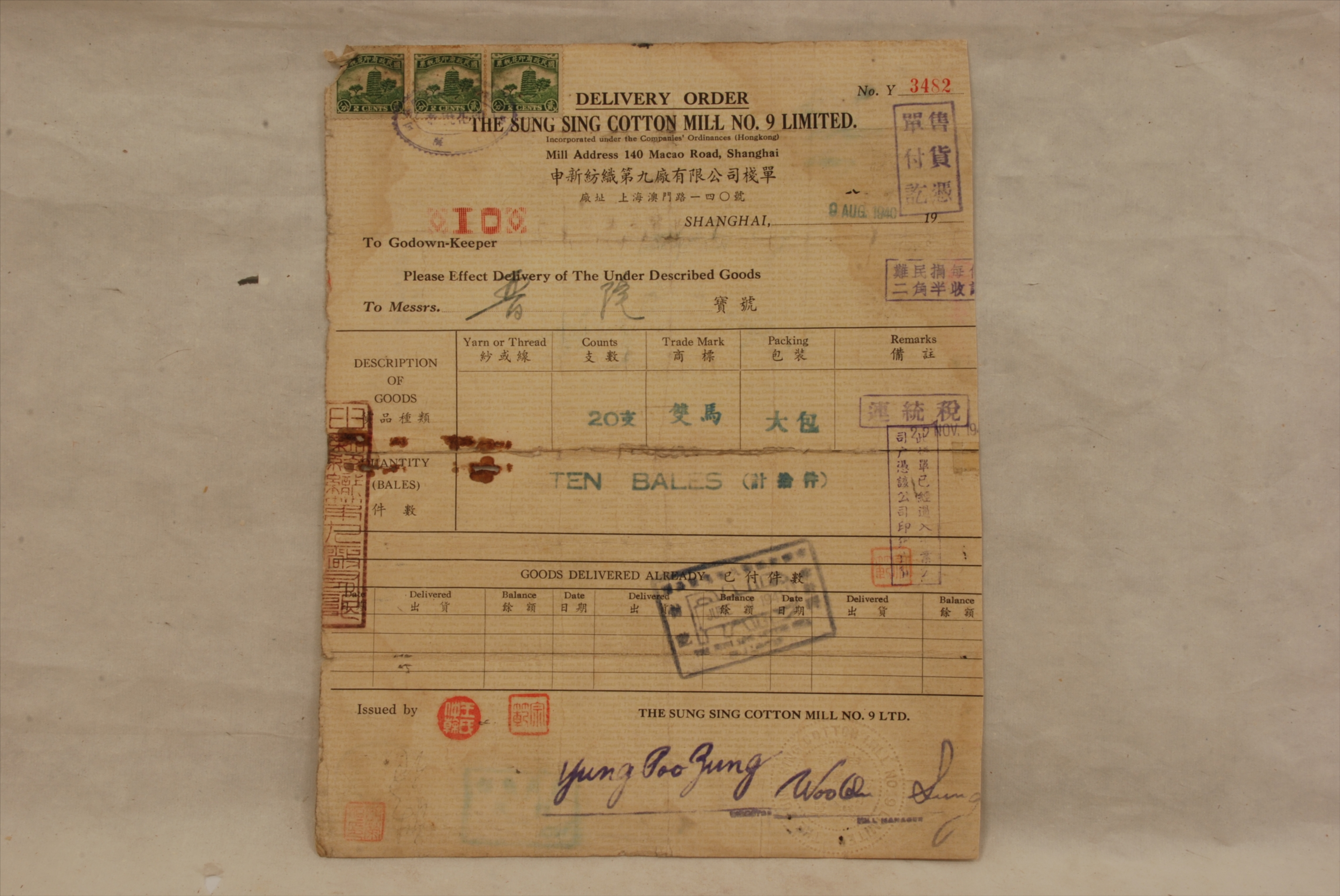 1940年8月9日上海申新纺织第九厂有限公司栈单