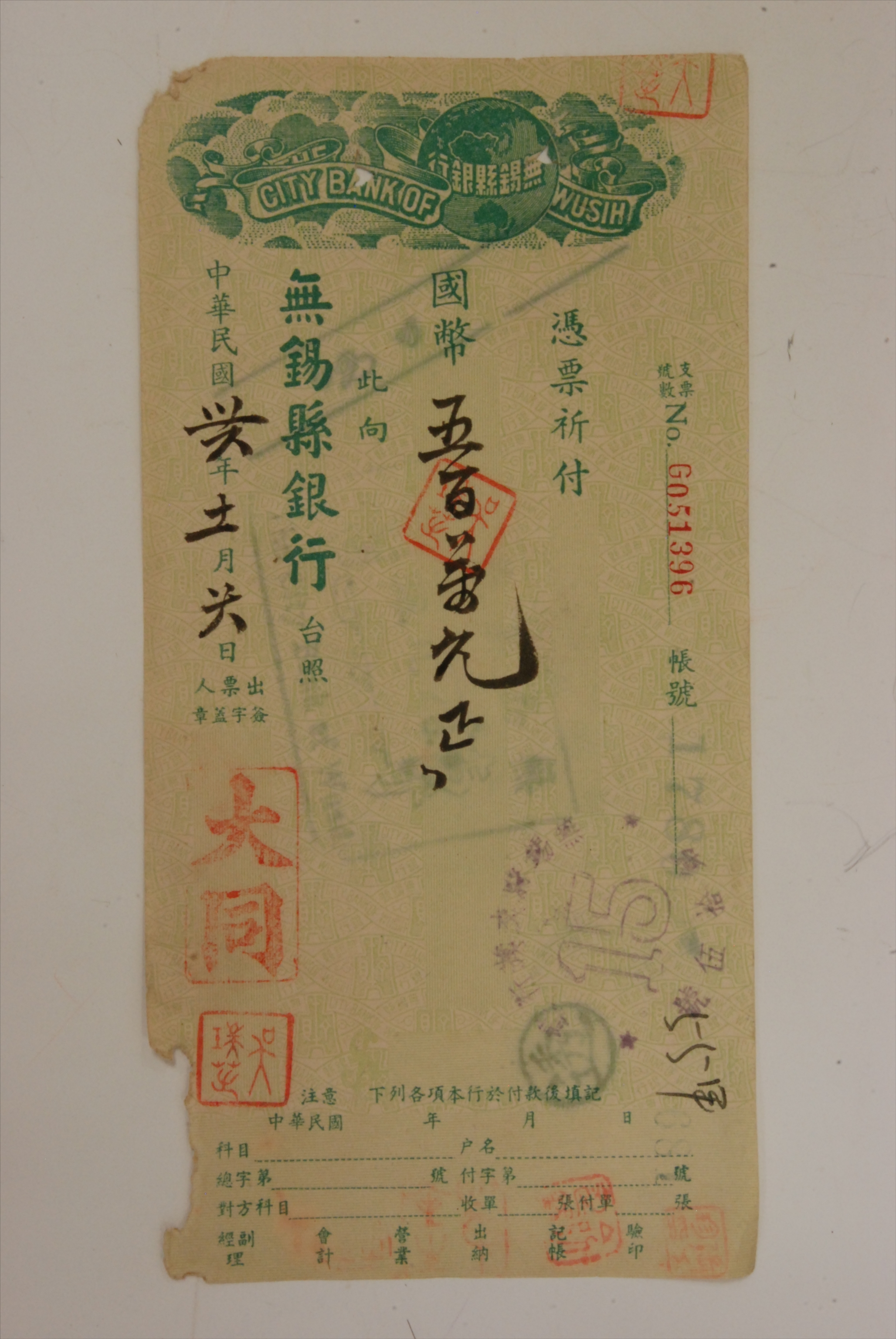1947年11月28日无锡县银行支票