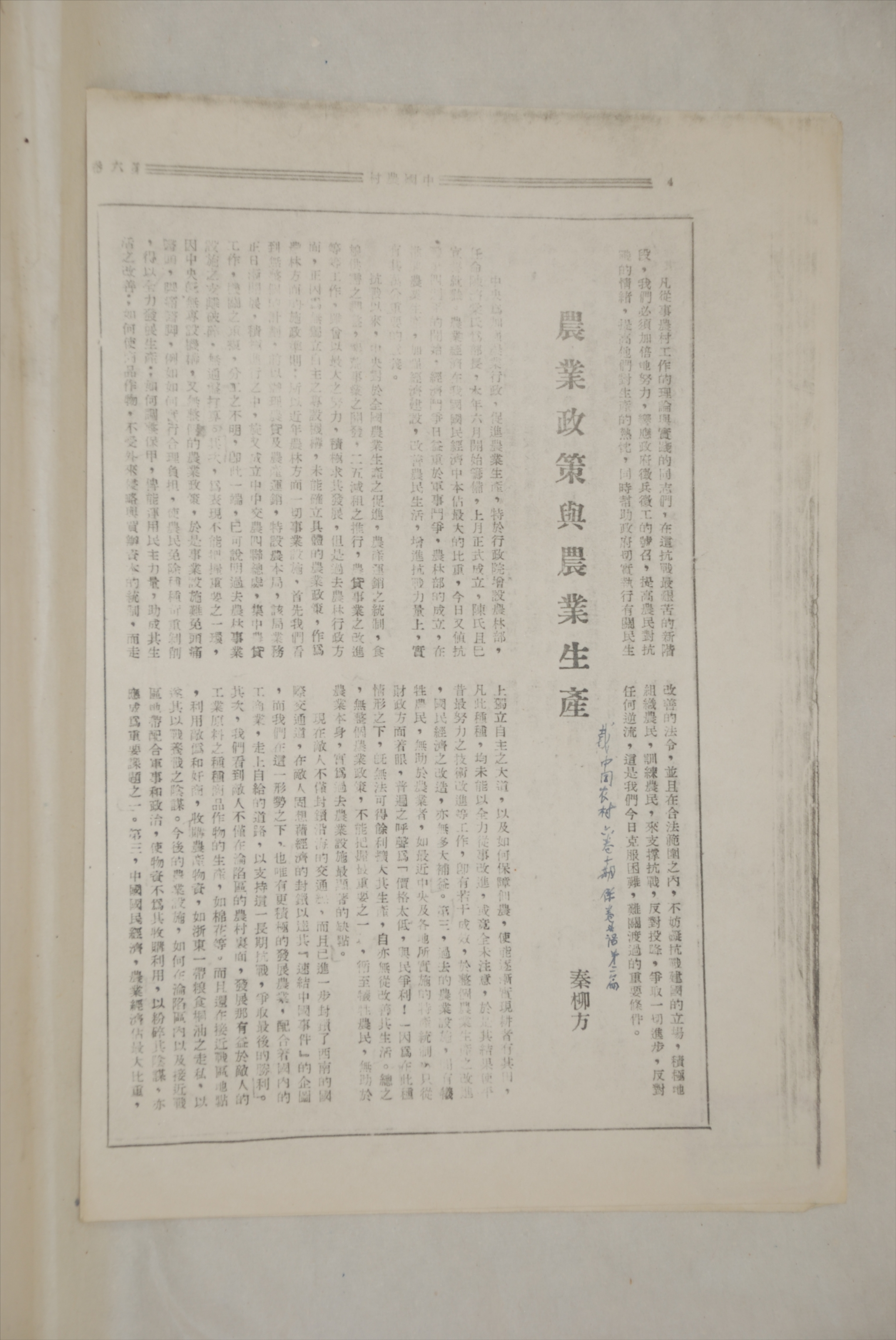 现代秦柳方发表的《农业政策与农业生产》复印件
