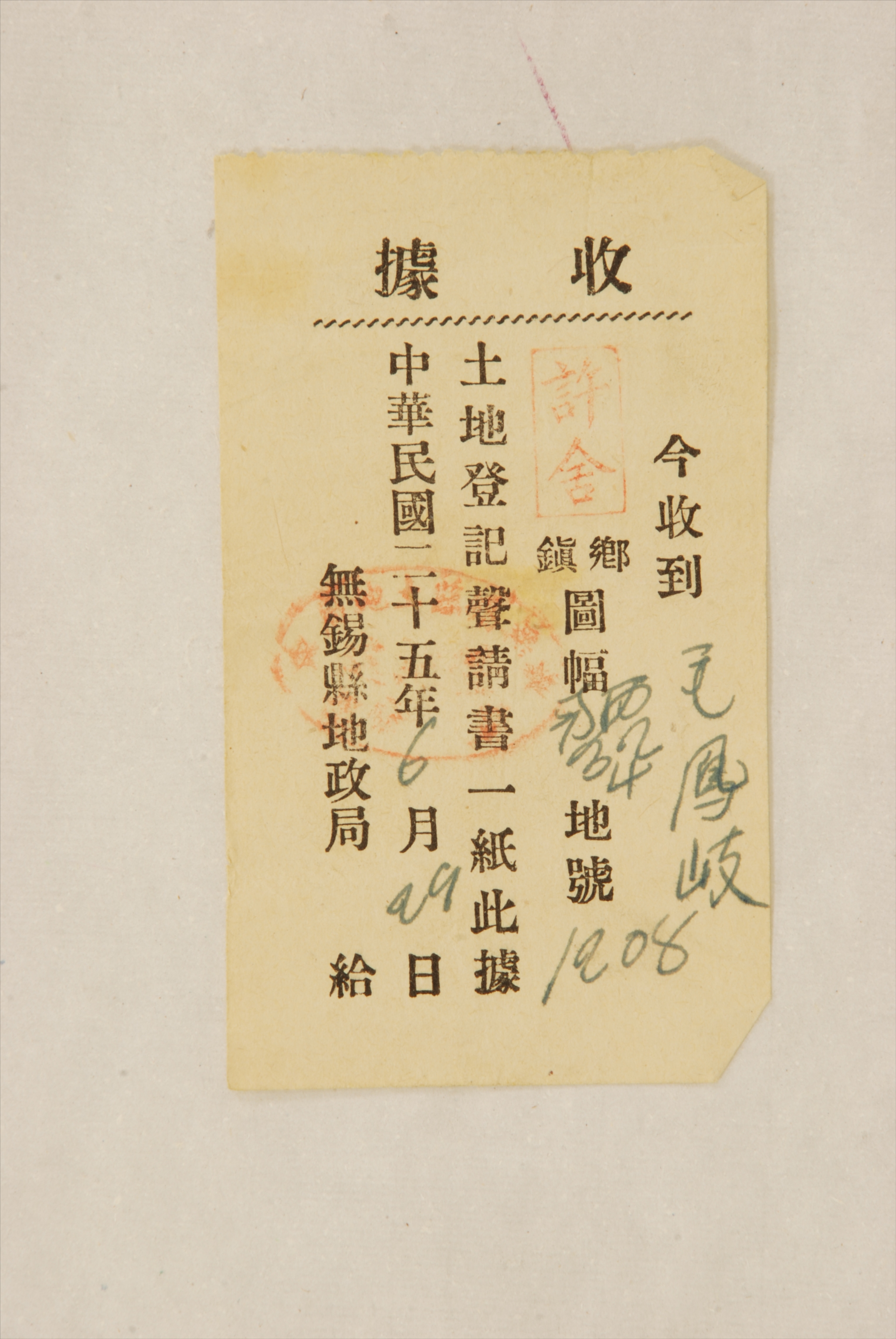 1936年6月29日无锡县地政局出具给毛凤岐的收据