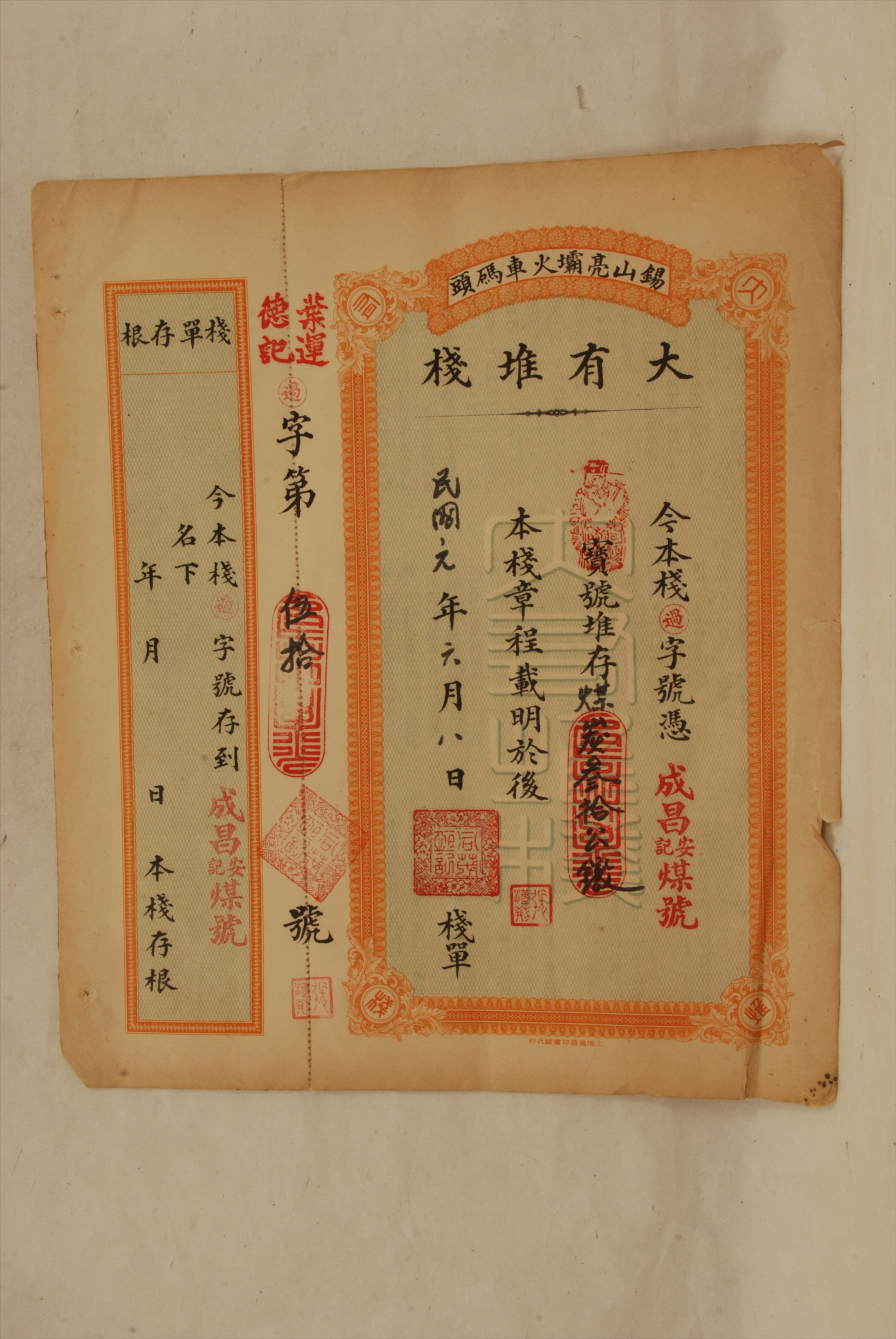 1912年6月8日锡山亮壩火车码头大有堆栈栈单