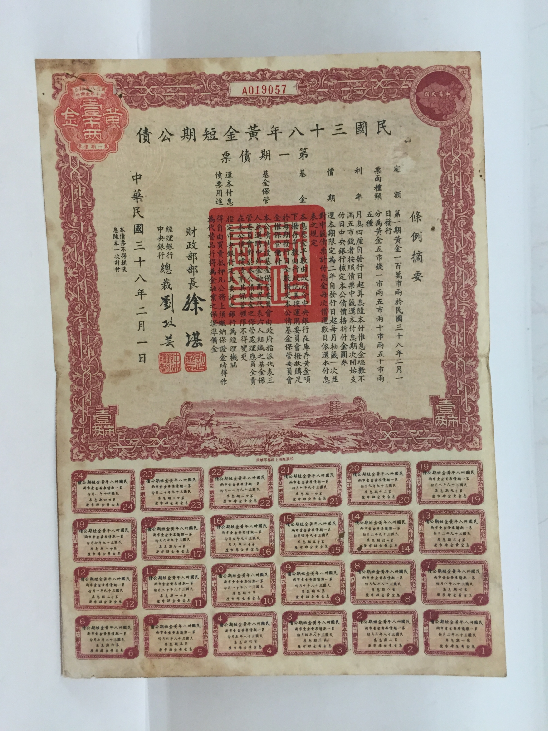 民国三十八年黄金短期公债第一期债票壹市两