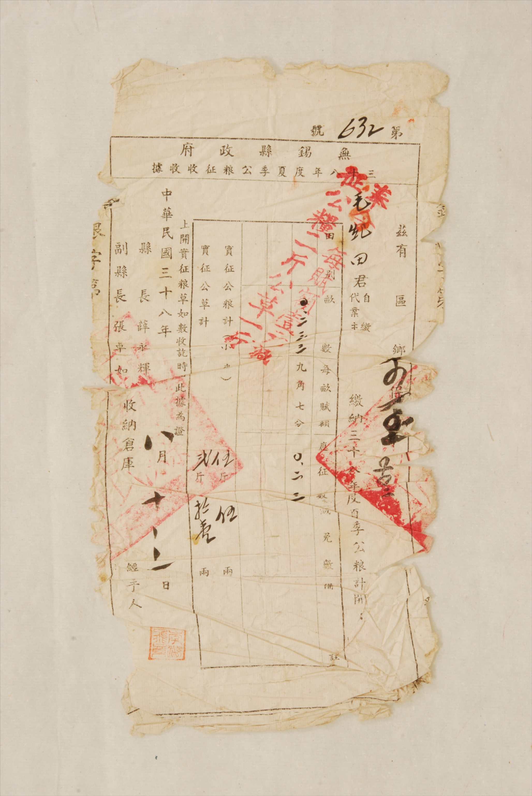 1949年无锡县政府出具给毛纪田的夏季公粮征收收据