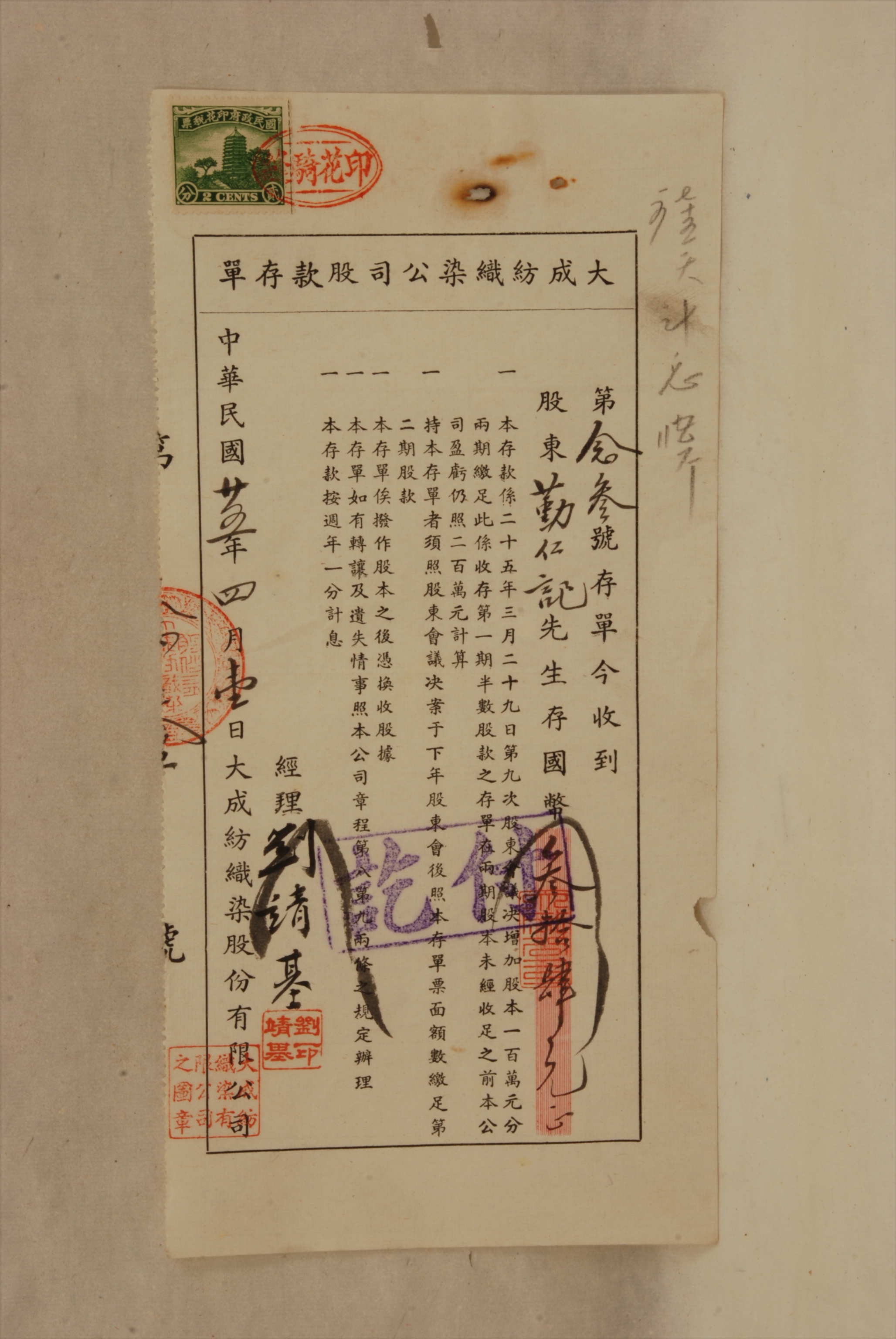 1936年4月1日大成纺织染公司出具给勤仁记的股款存单