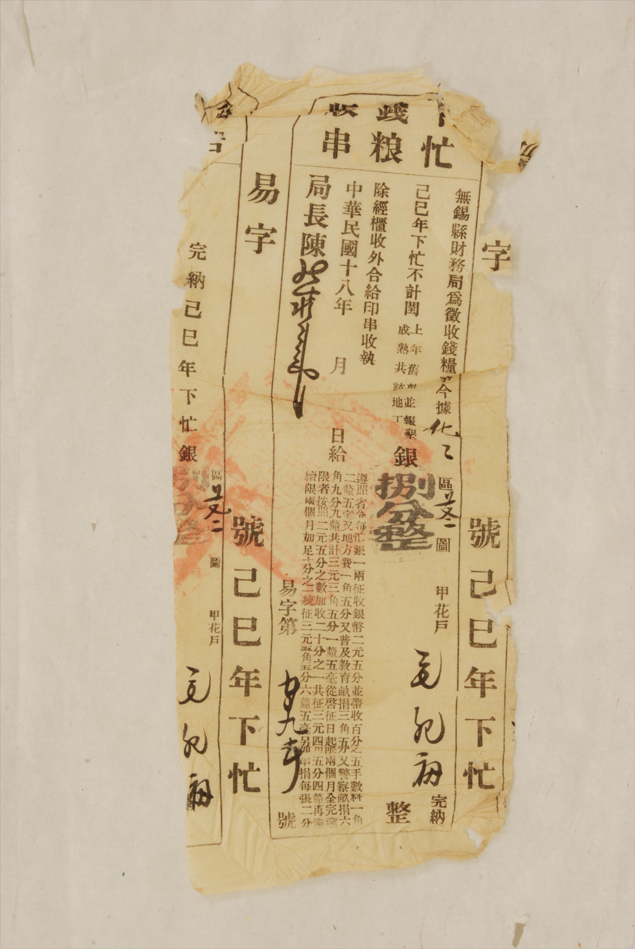 1929年无锡县财务局颁发给毛纪福的下忙钱粮版串