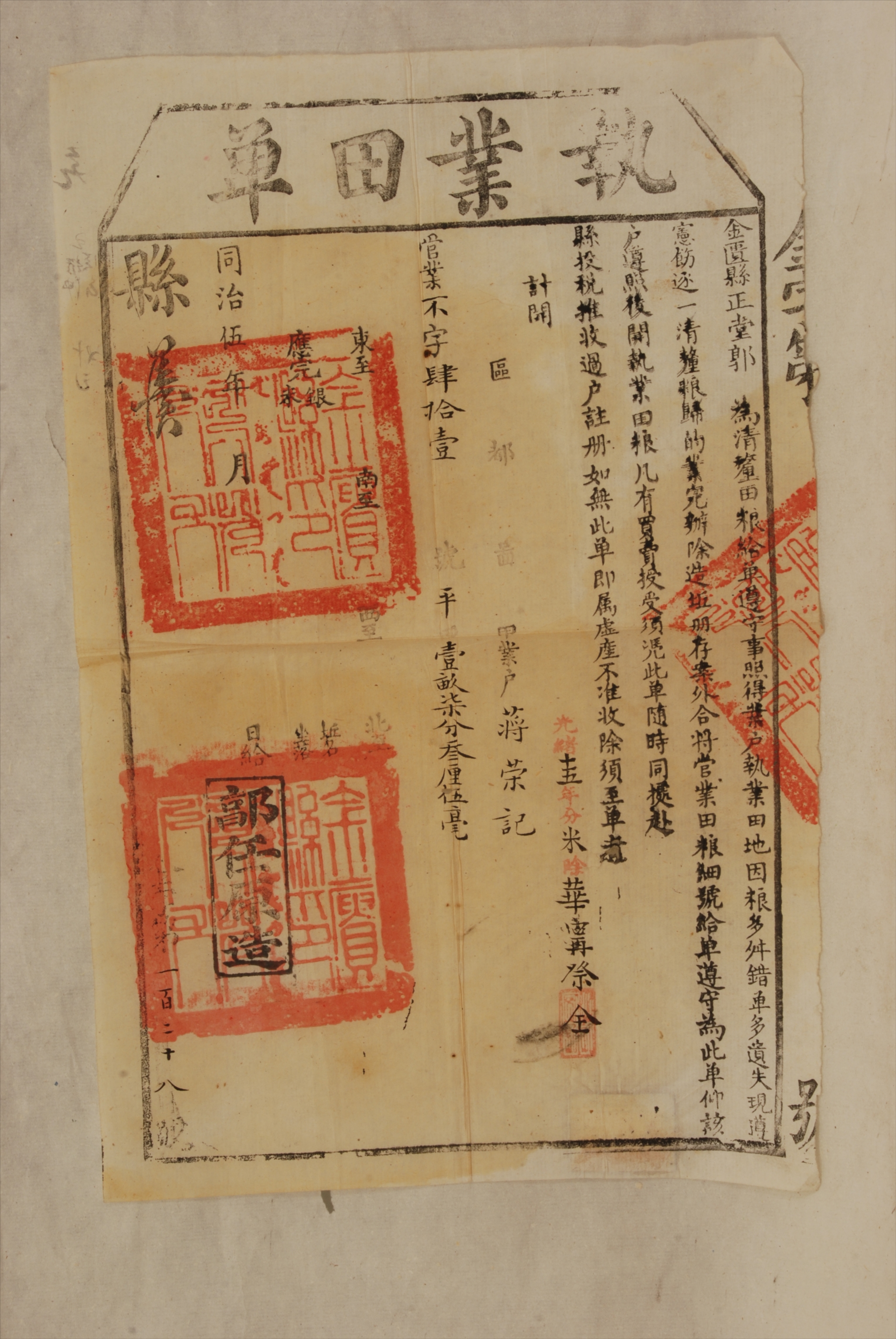 清同治五年金匮县颁发给蒋荣记的执业田单