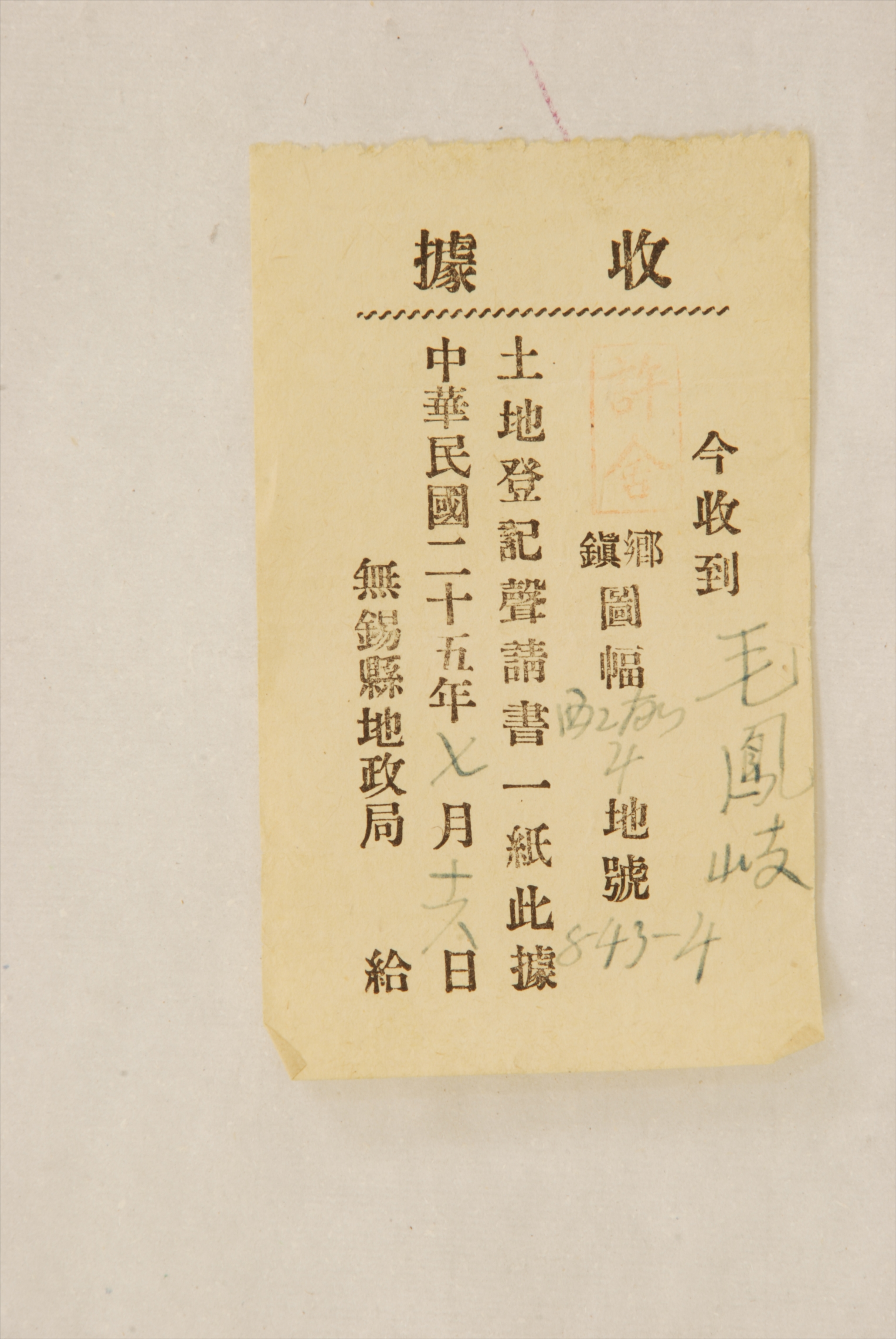 1936年7月16日无锡县地政局出具给毛凤岐的收据