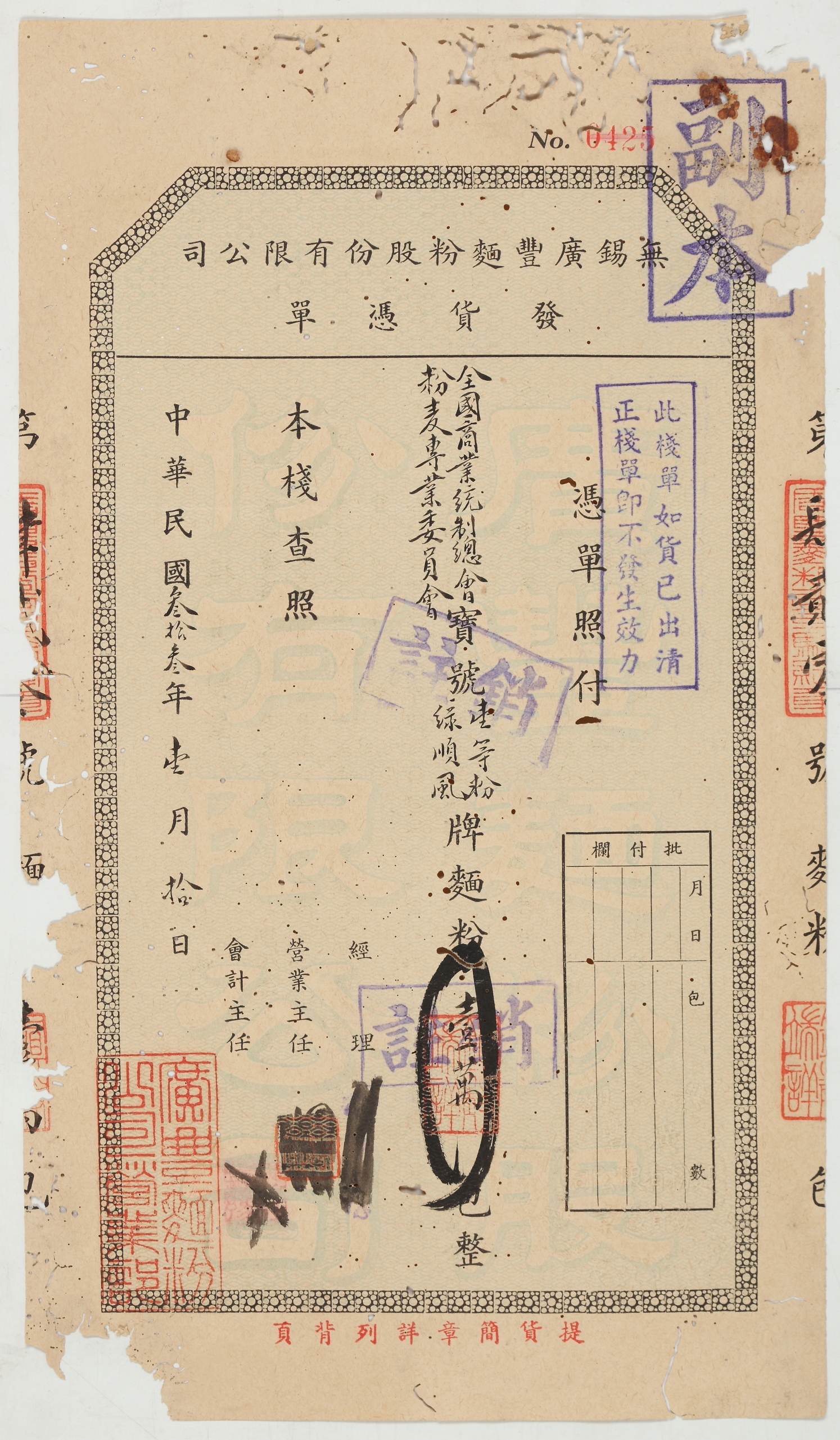 1944年1月10日无锡广丰面粉股份有限公司发货凭单