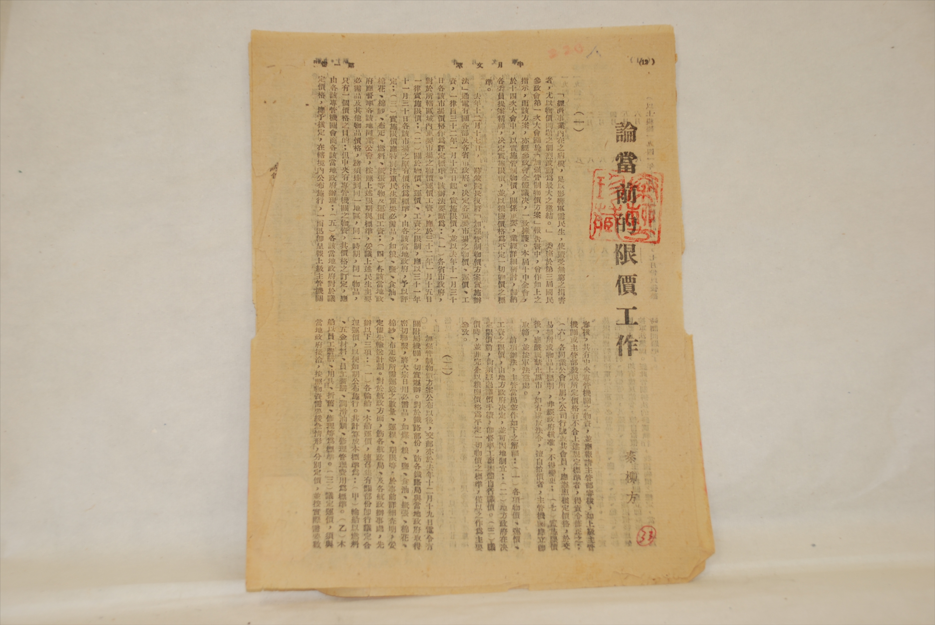 1943年1月28日秦柳方发表的《论当前的限价工作》