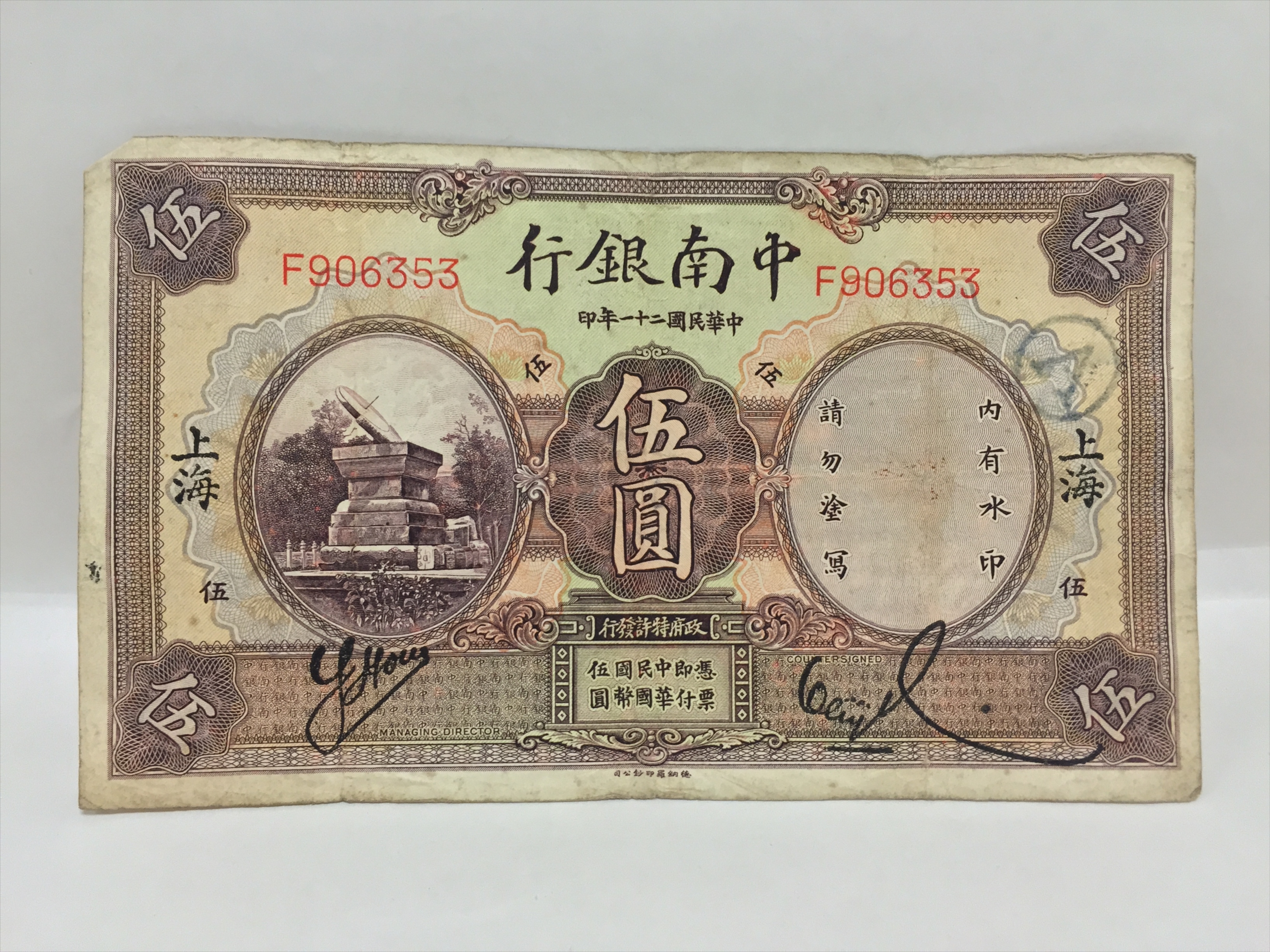 民国二十一年中南银行伍圆纸币