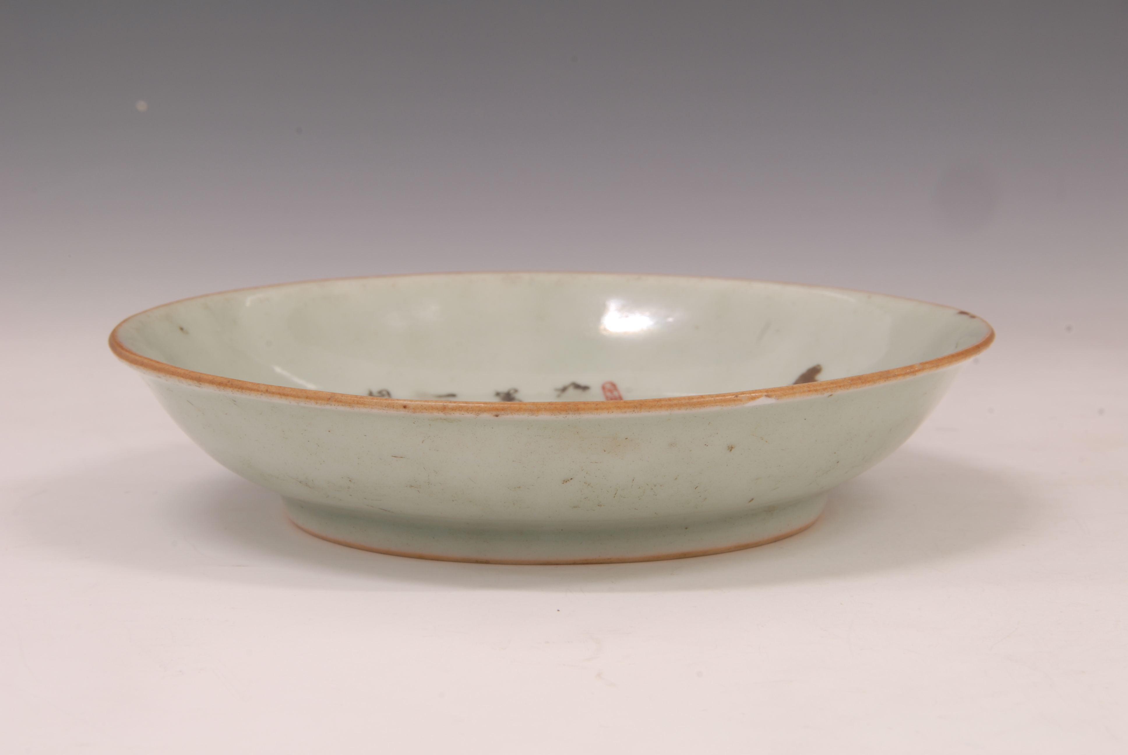清“大清乾隆年制”款豆青地粉彩花鸟纹瓷盘