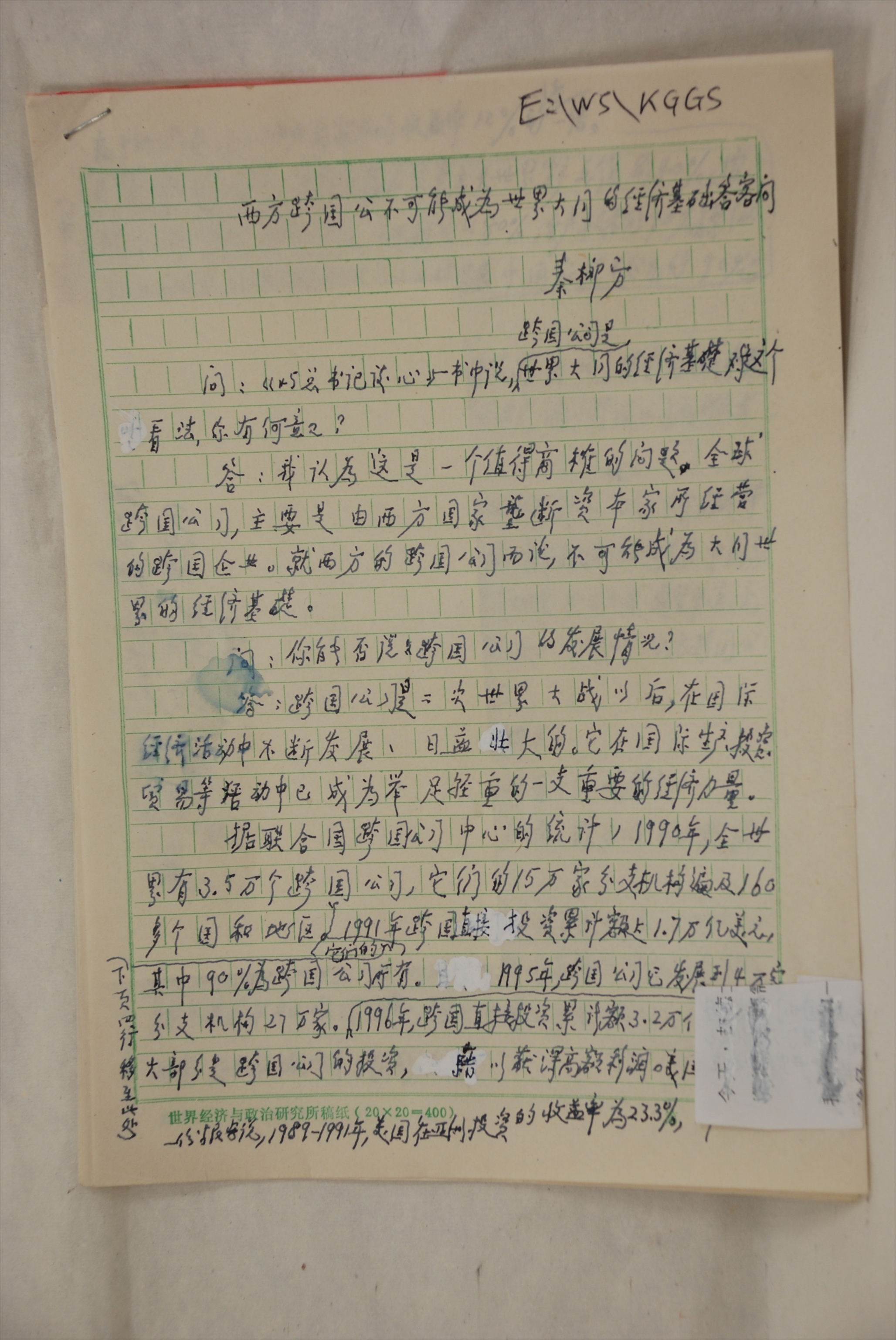 1998年1月28日秦柳方撰写的《西方跨国公司不可能成为世界大同的经济基础答客问》