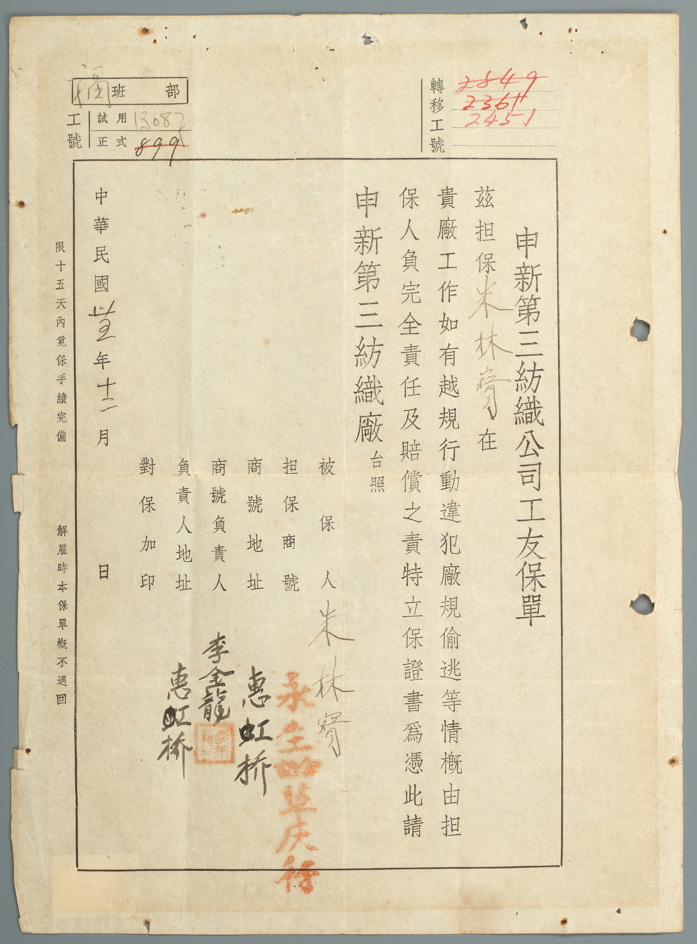 1946年12月申新第三纺织公司朱林宝的工友保单