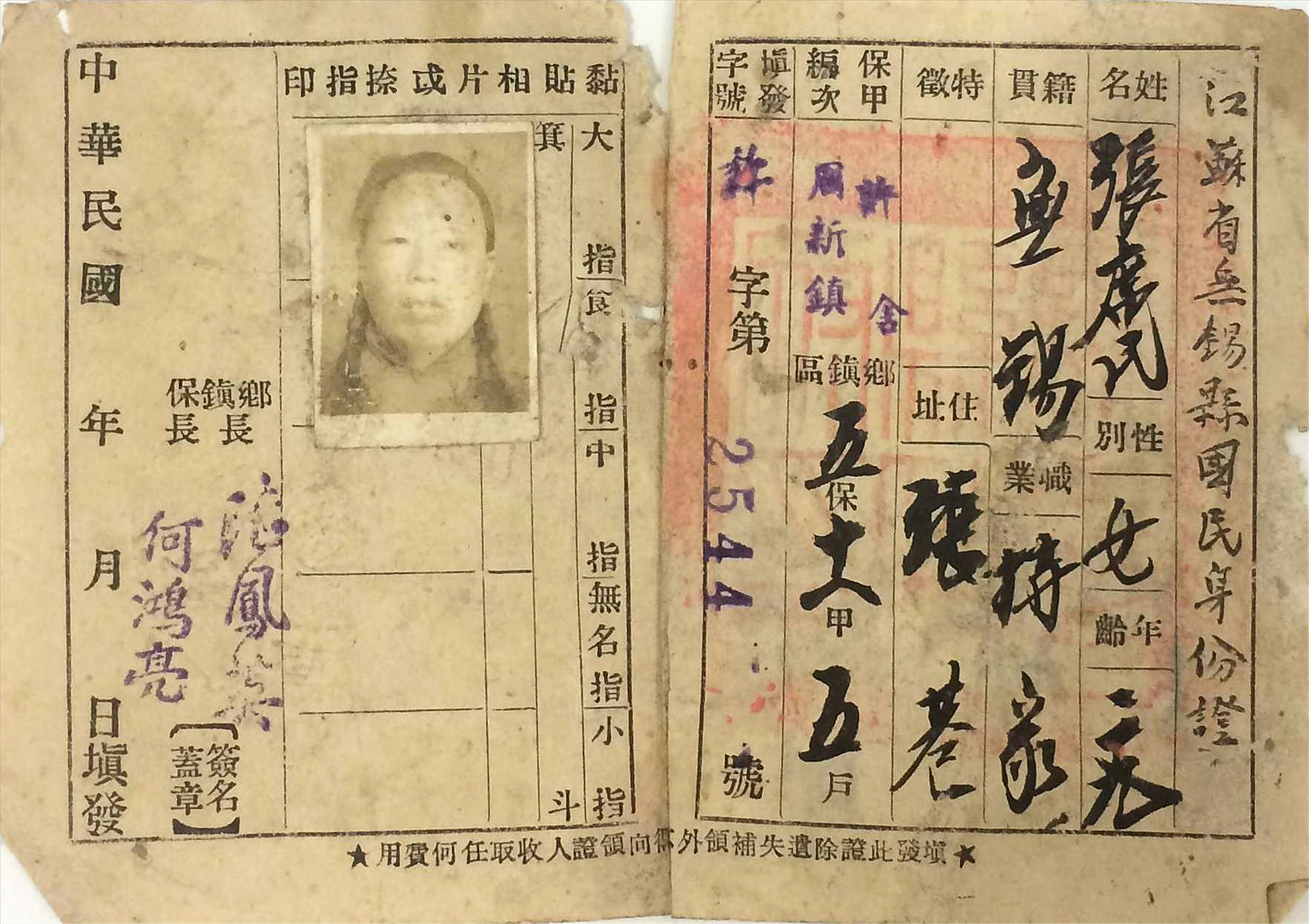 1946年颁发给张席氏的江苏省无锡县国民身份证