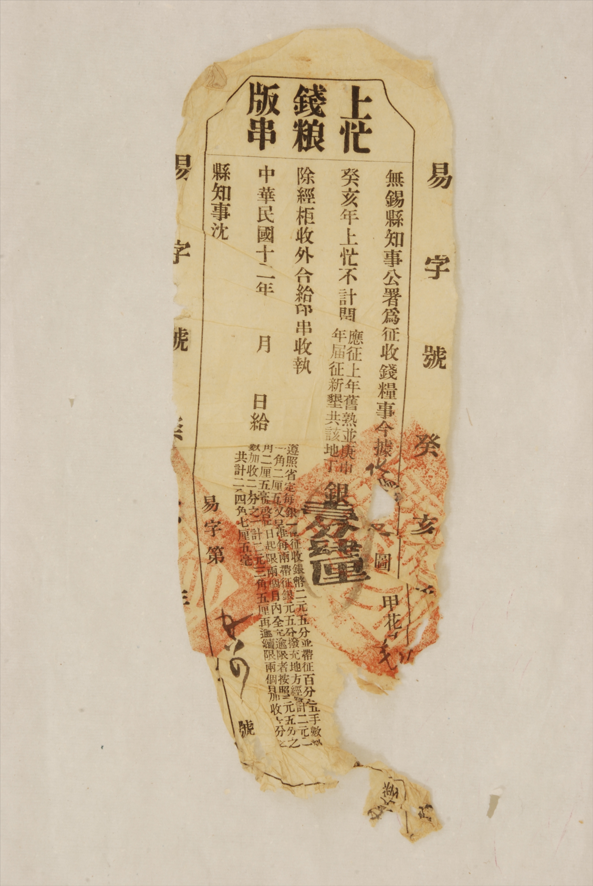 1923年无锡县知事公署颁发的上忙钱粮版串