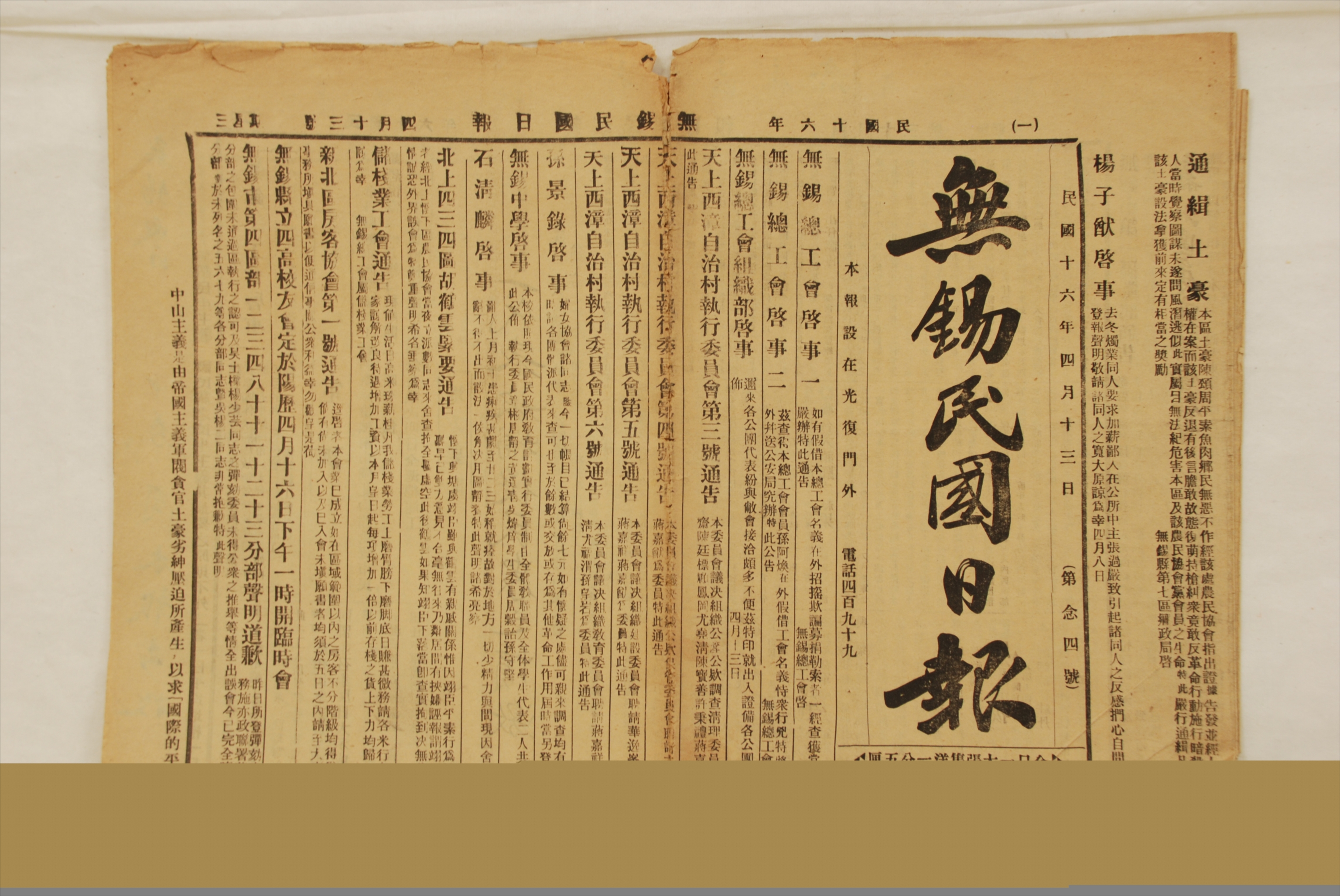 1927年4月13日《无锡民国日报》