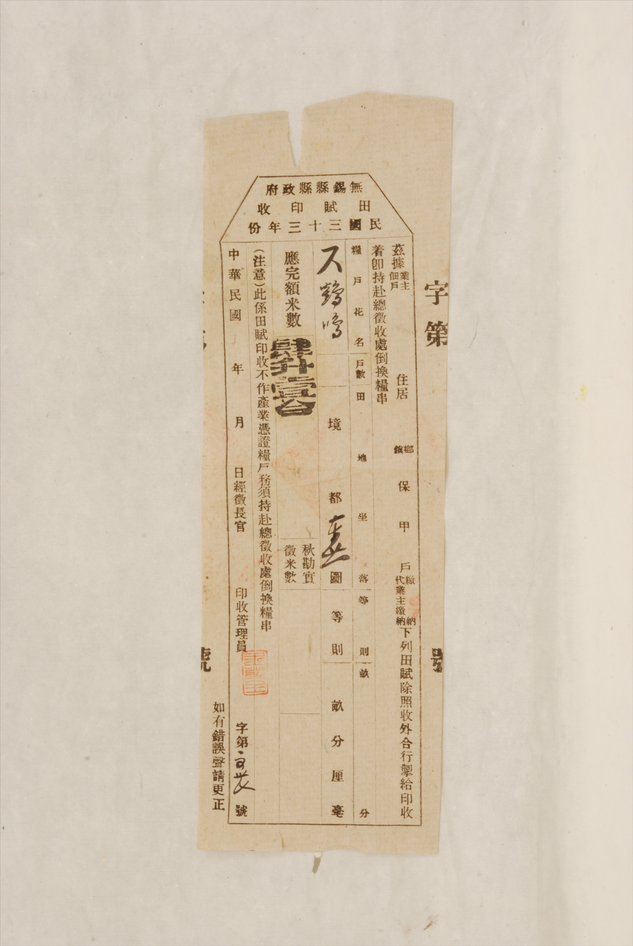 1944年无锡县县政府出具给陆鹤鸣的田赋印收