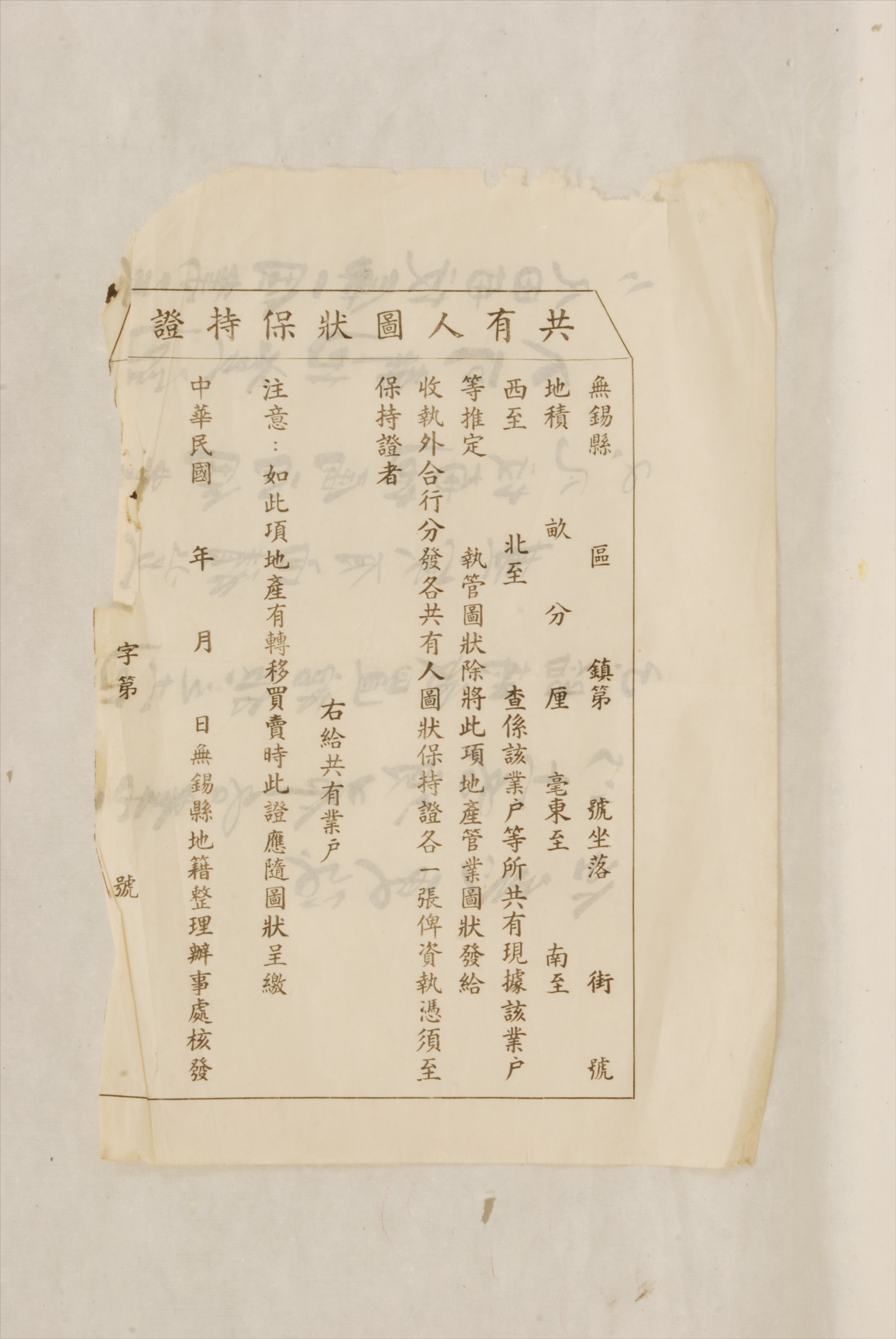 民国无锡县地籍整理办理处的共有人图状保持证空白页