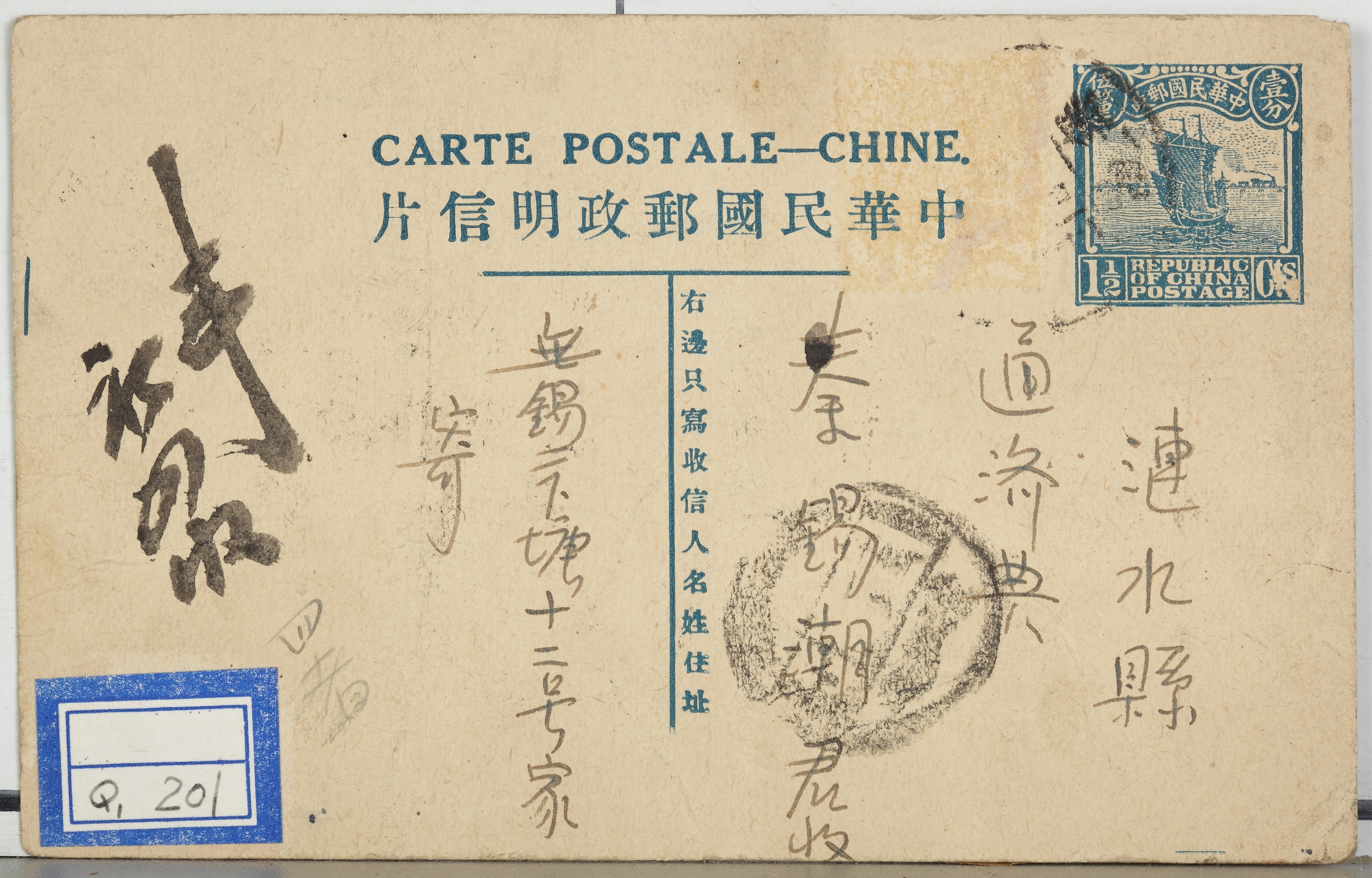 民国秦起寄给秦锡潮的明信片