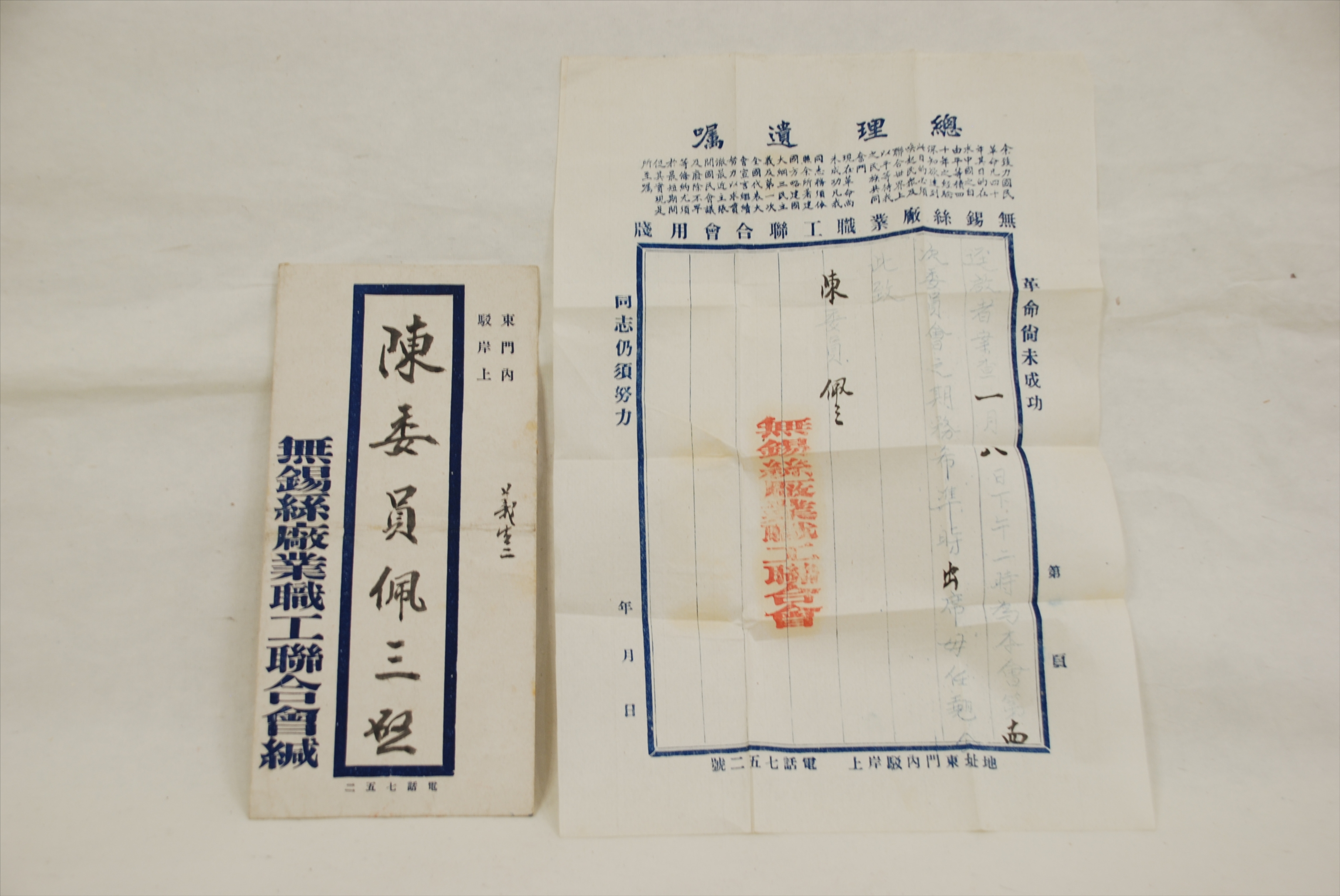 民国无锡丝厂业职工联合会给陈佩三的通知