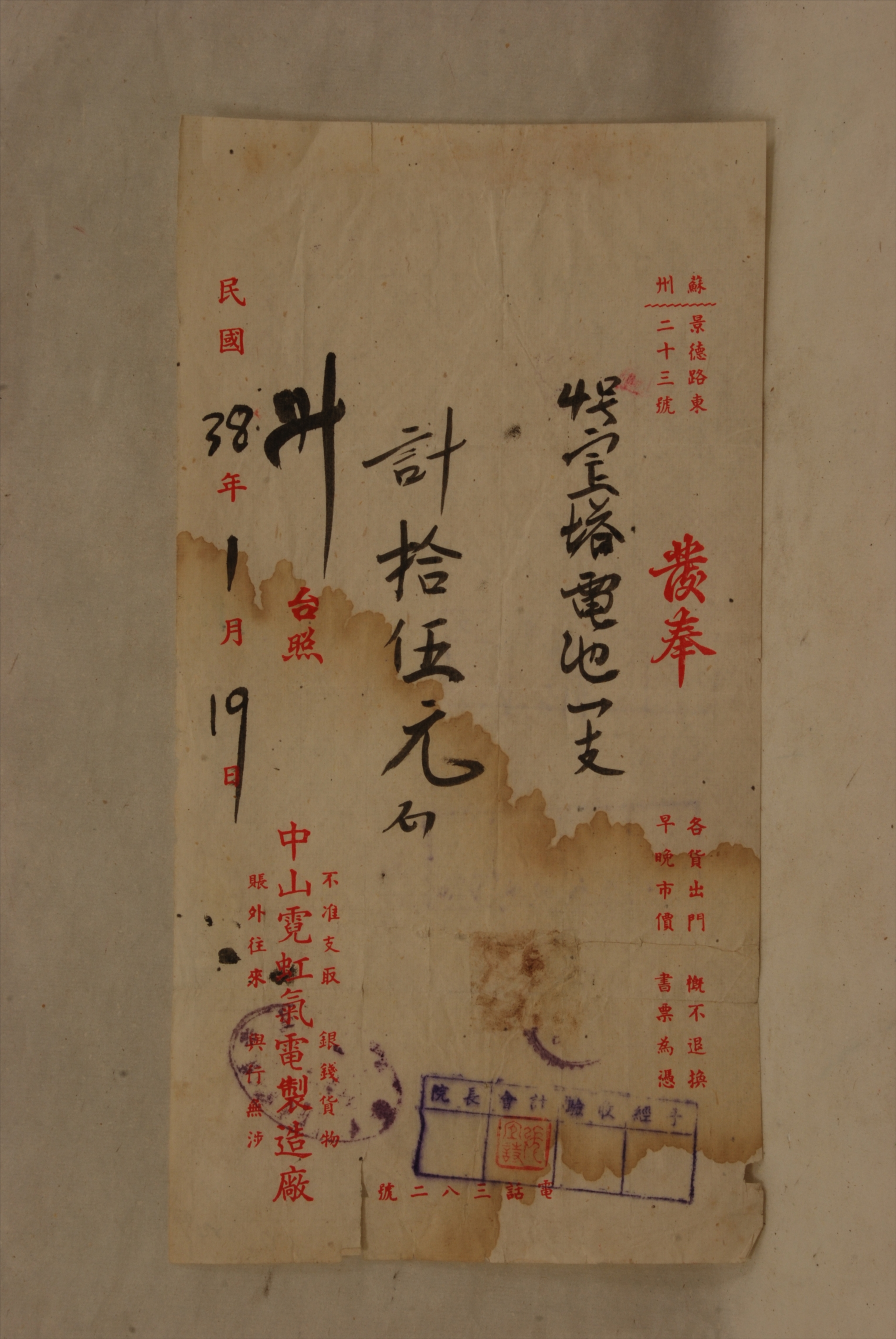 1949年1月19日苏州中山霓虹气电制造厂出具的发票