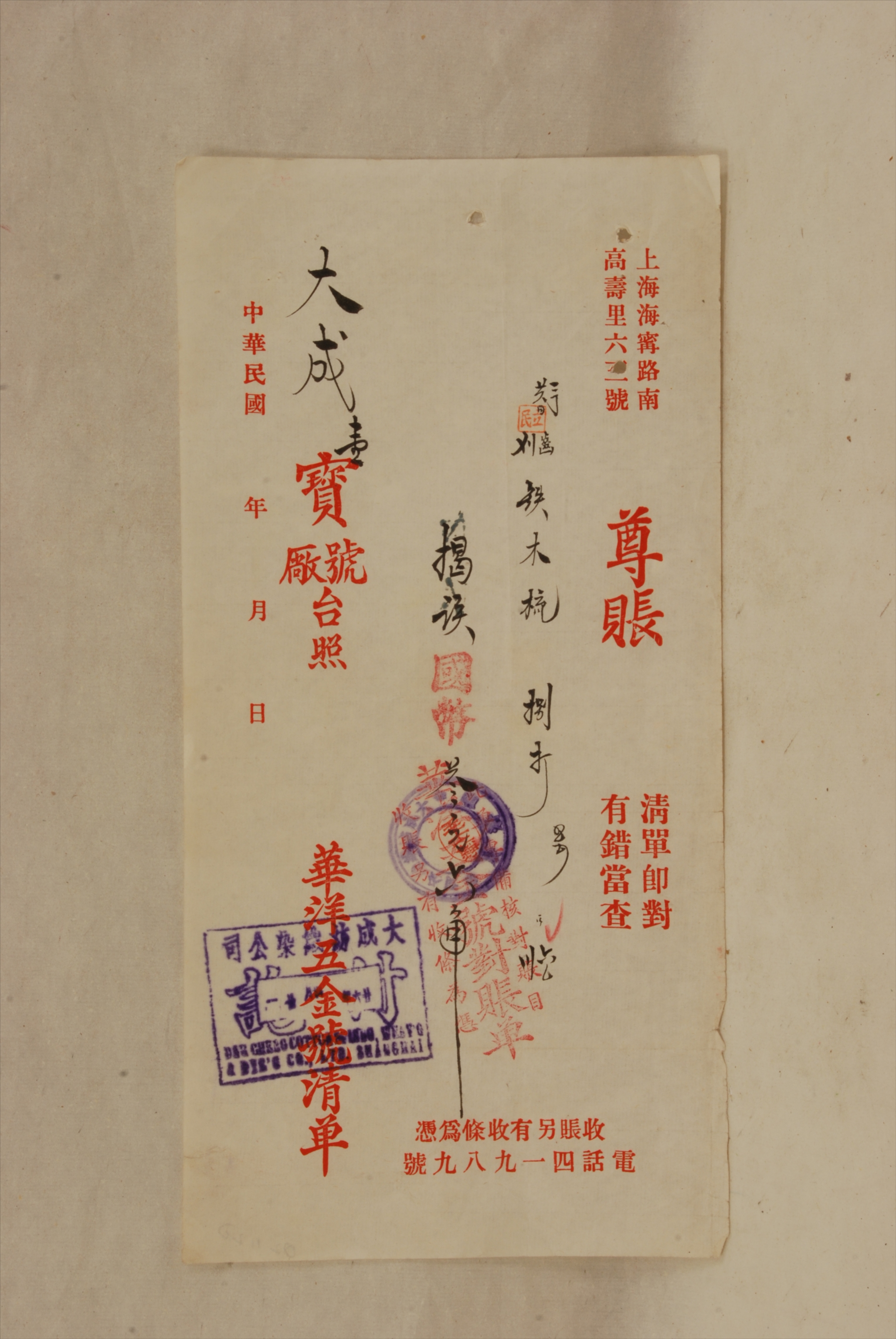 1937年上海华洋五金号出具给大成纺织染公司的对账单