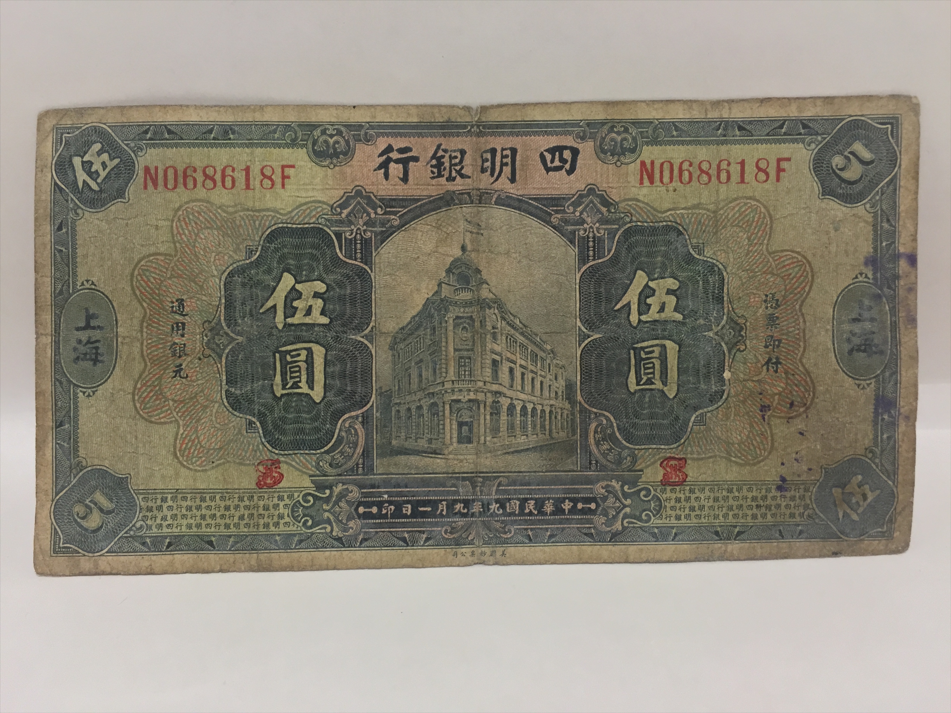 民国九年四明银行伍圆纸币