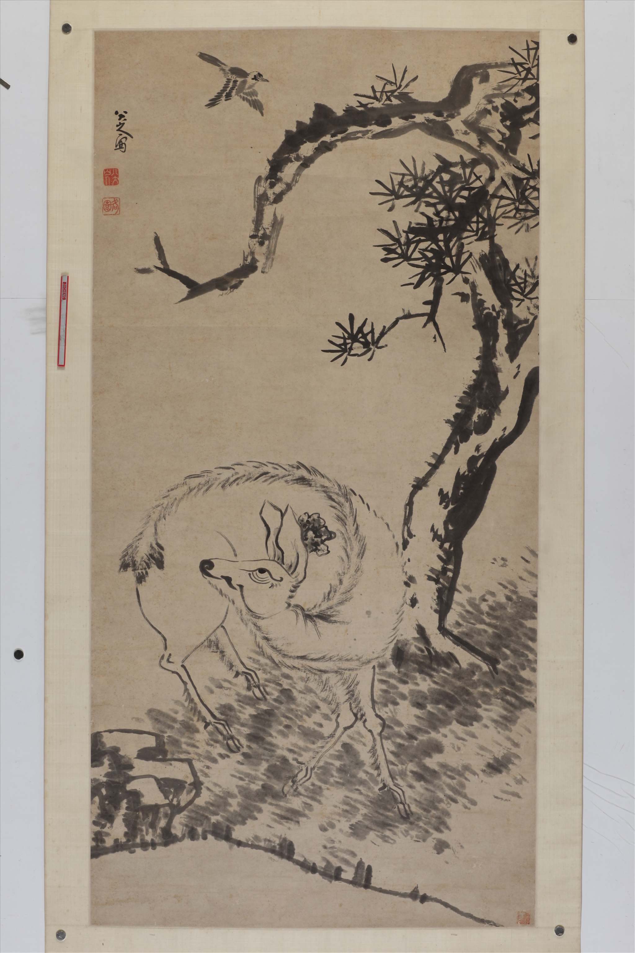 清朱耷松鹿飞禽图轴