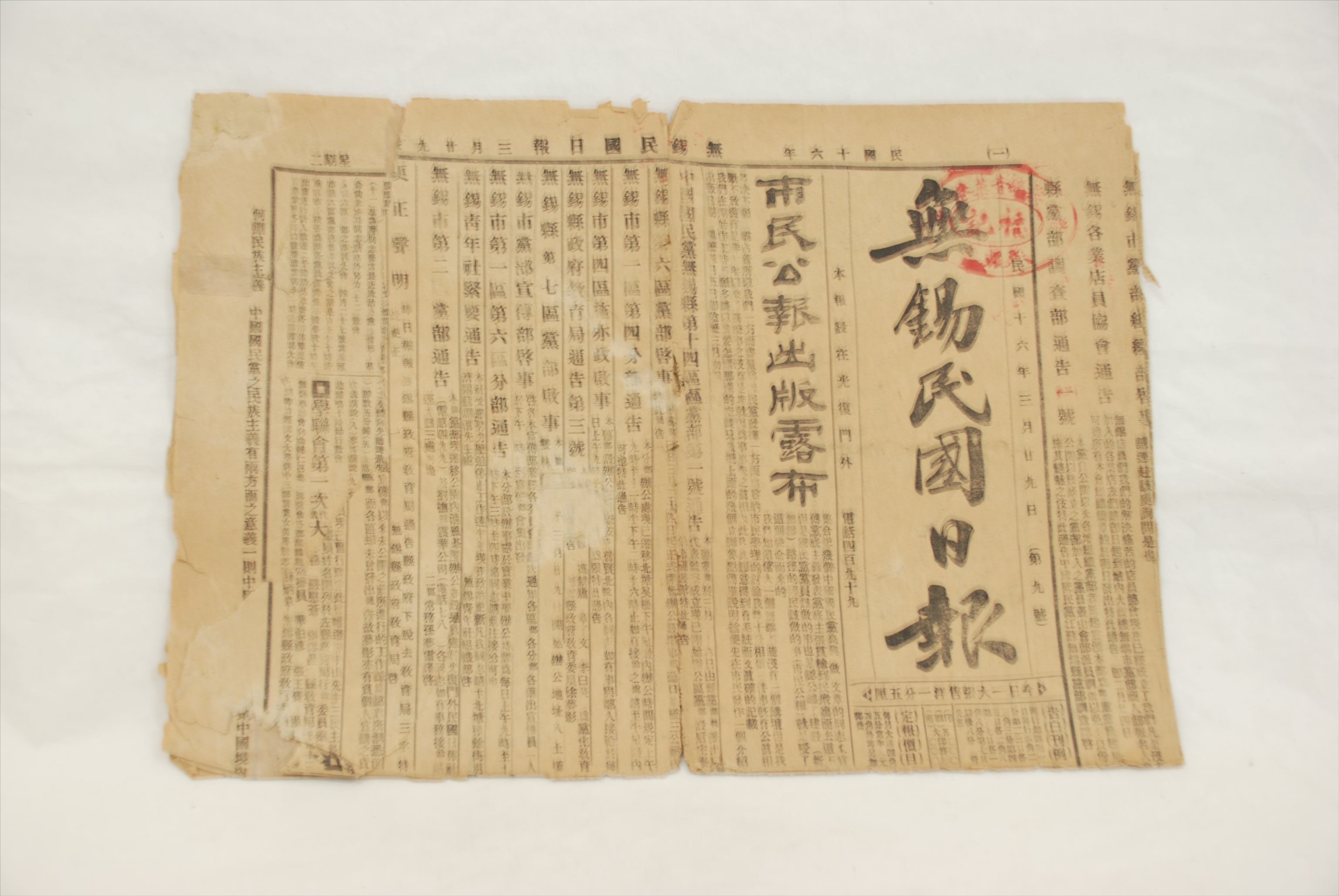 1927年3月29日《无锡民国日报》