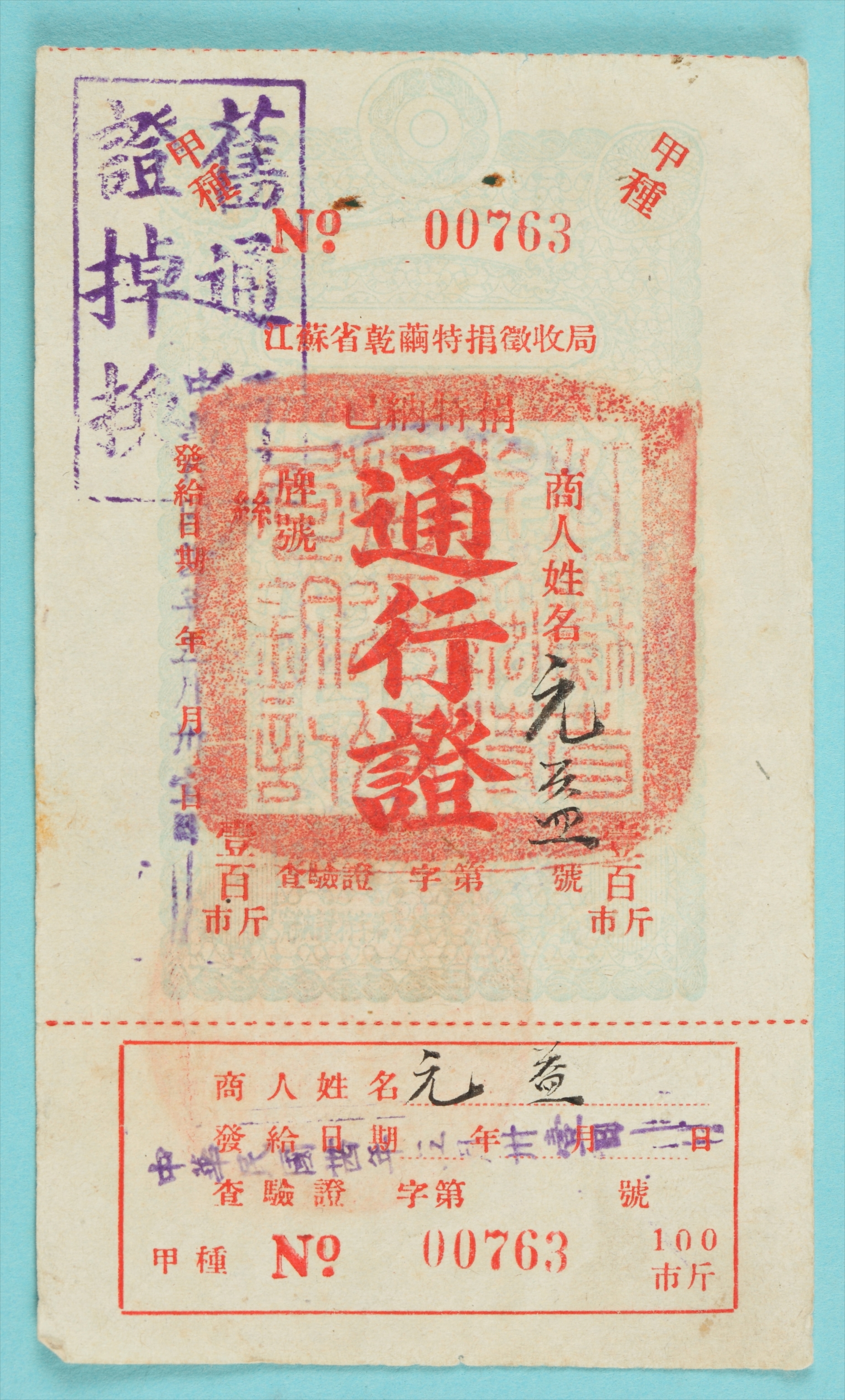 1945年5月31日江苏省干茧特捐征收局颁发给元益的通行证