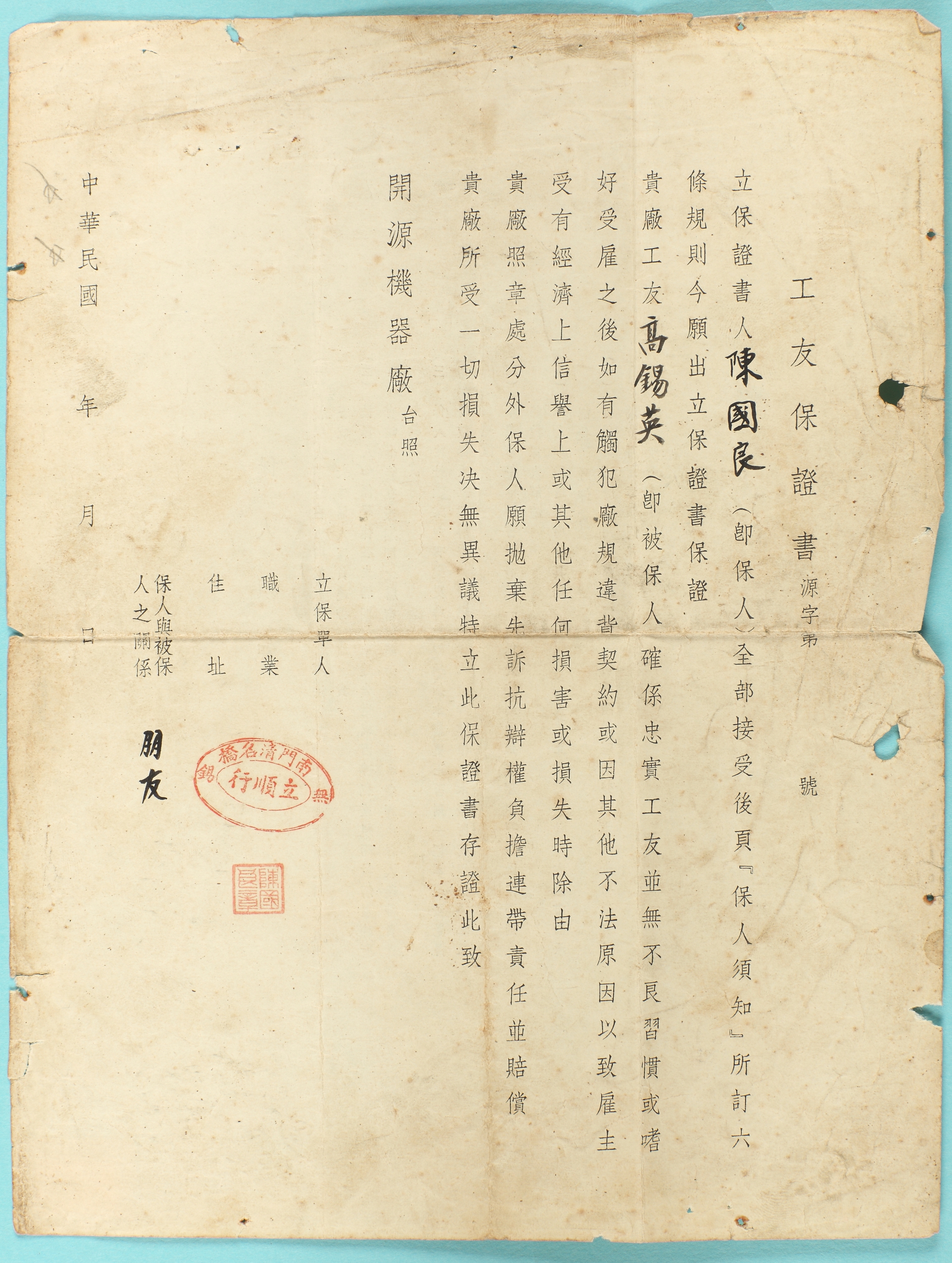 民国陈国良出具给开源机器厂的工友保证书