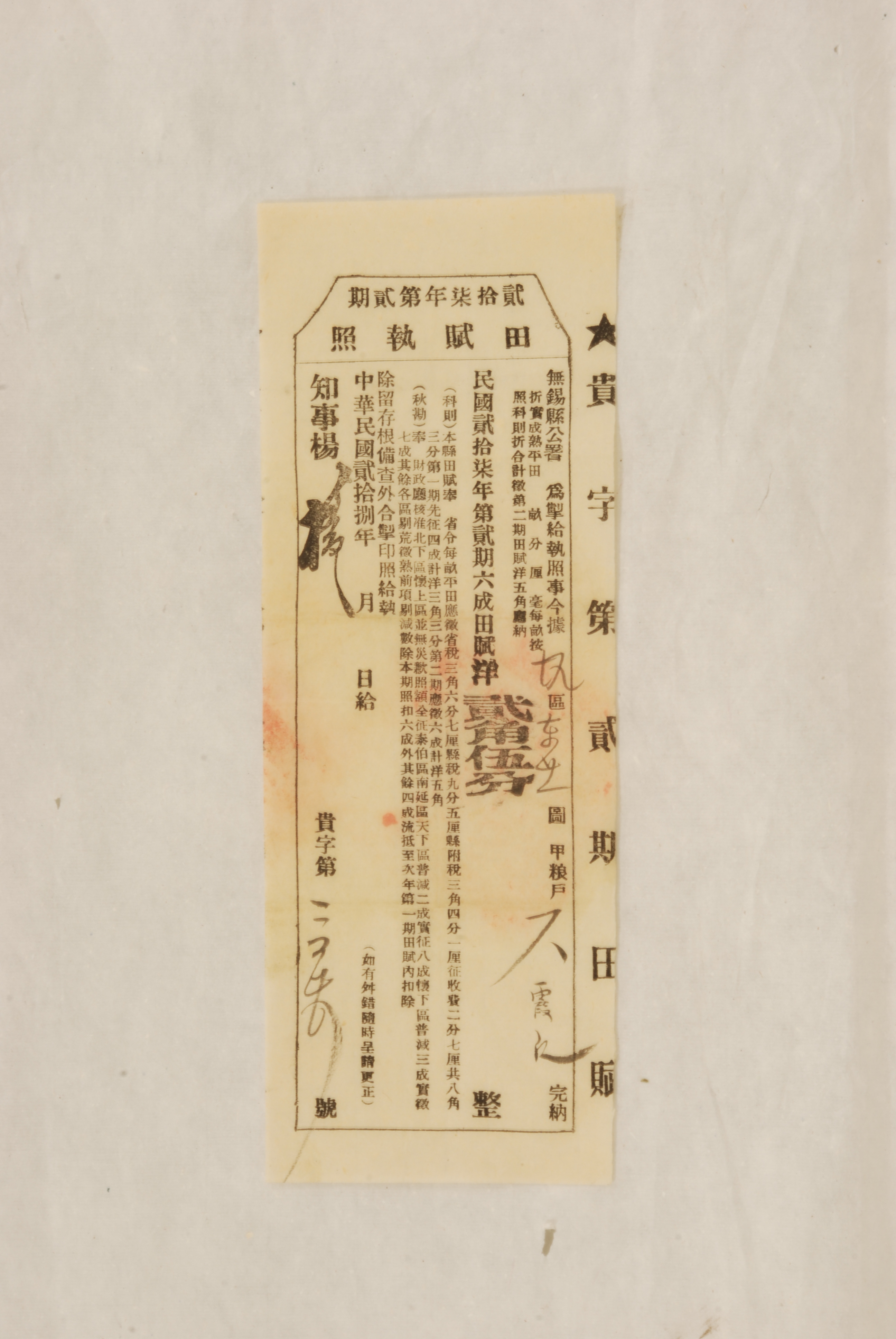 1938年无锡县公署颁发给陆霞记的第二期田赋执照
