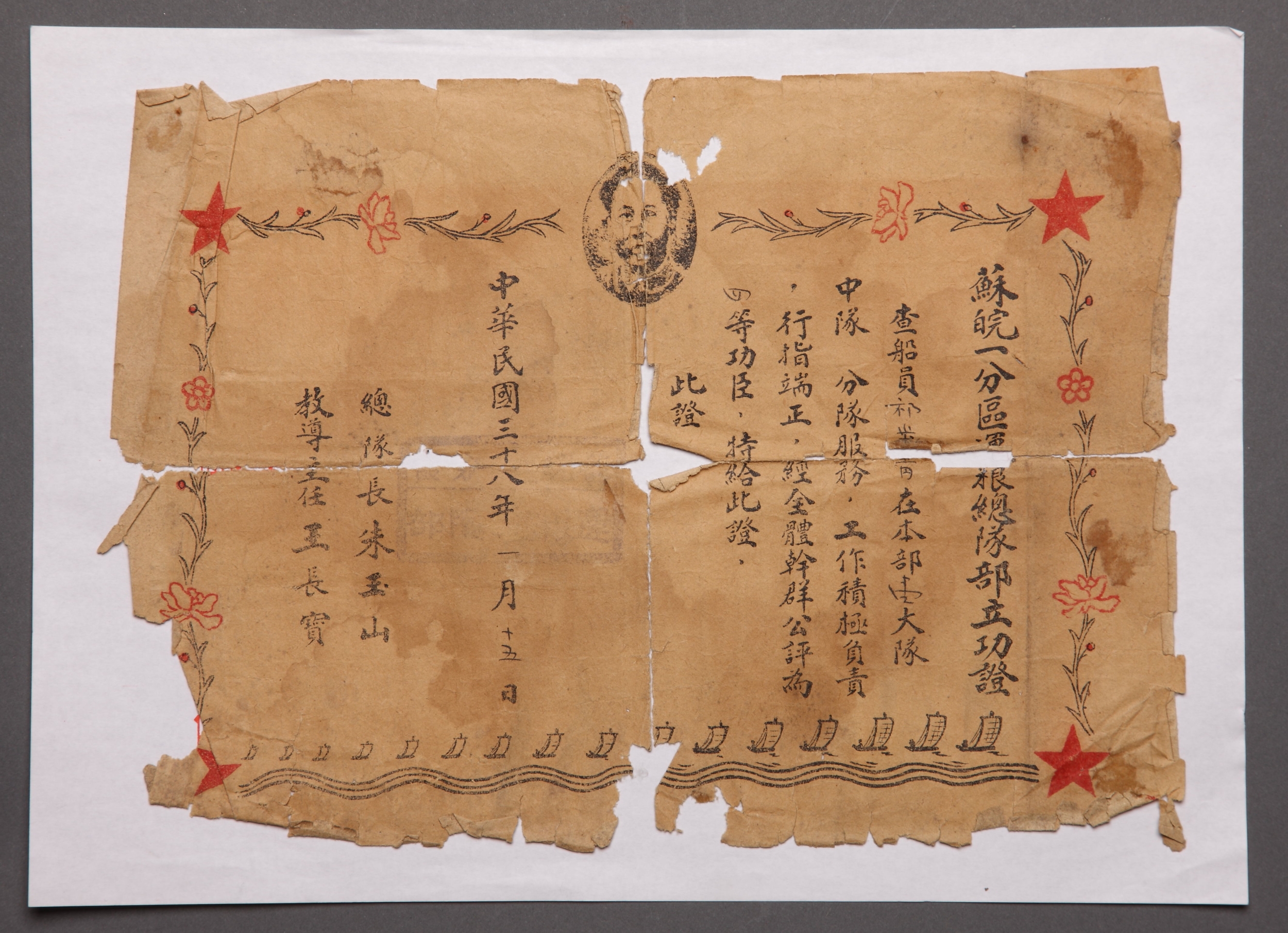 1949年1月15日苏皖一分区运粮总队部颁发给祈步清的“四等功”立功证